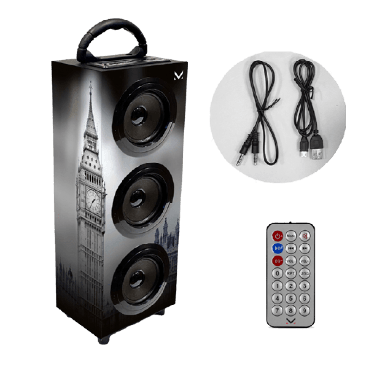 nSISTEMA MULTIMEDIALE WIRELESS AUDIOnn3 ALTOPARLANTI E 1 SUBWOOFERnnParty speaker Wireless audio (AD2P)nn3 altoparlanti e 1 subwoofernnIngresso USB e SD MMC (per la riproduzione di file MP3)nnIngresso AUX da 3,5mm (cavo AUX incluso)nnFunzione EqualizzatorennRegolazione volume e toni bassinnTelecomando in dotazione (batteria inclusa)nnDisplay LED luce rossannBatteria ricaricabile al litio da 2000mAh integrata (caricatore non incluso)nnRicarica batteria tramite cavo USB (cavo in dotazione)nnPeso: 0,900 Kg.