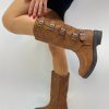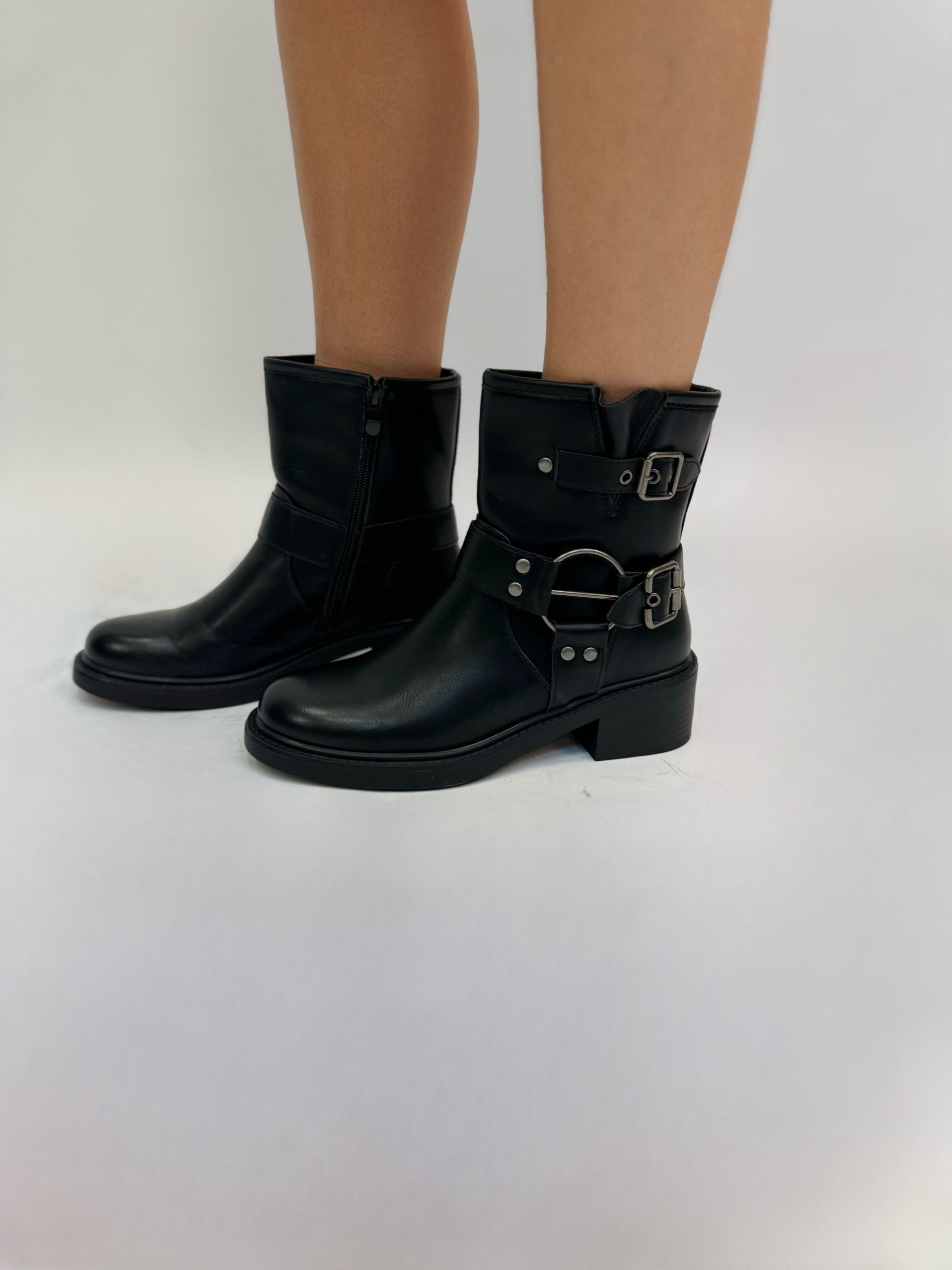 Stivali in ecopelle con dettaglio di applicazione di fibbie. Modello a punta rotonda.