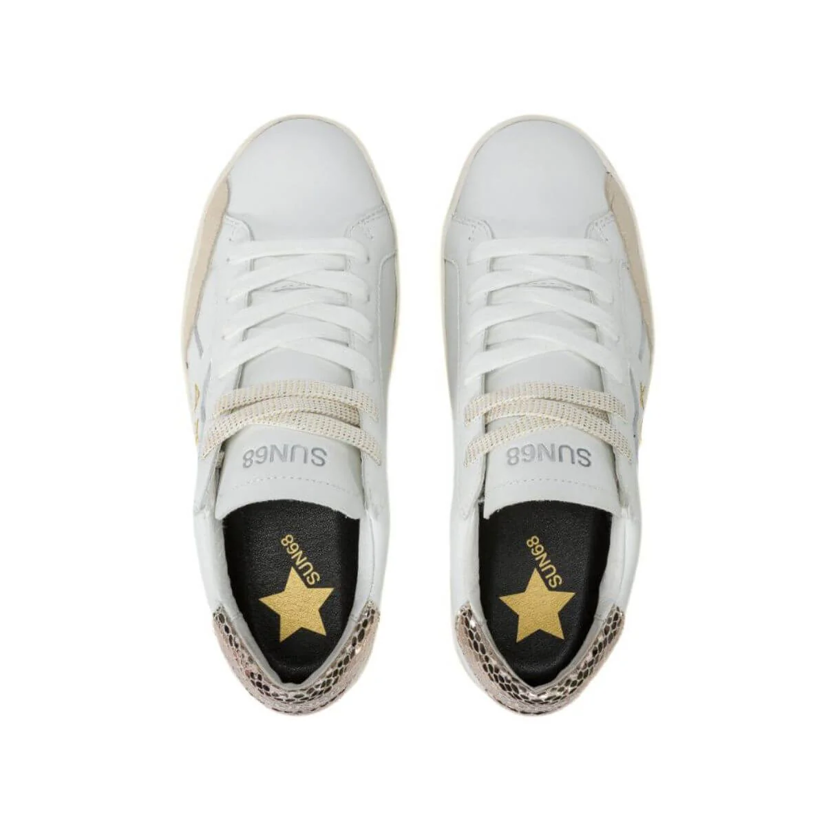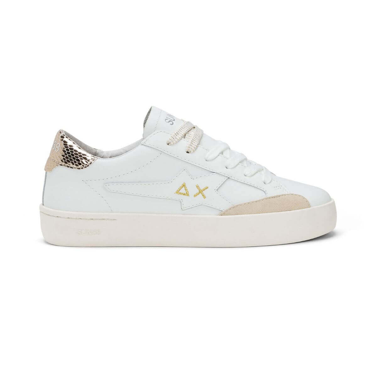 Esalta il tuo stile con le sneaker SUN68. Tomaia in pelle bianca con tallone craccato oro. L’interno e il sottopiede rimovibile, foderati in pelle e non, garantiscono comfort e traspirabilità. Lacci di ricambi inclusi. Suola in gomma.