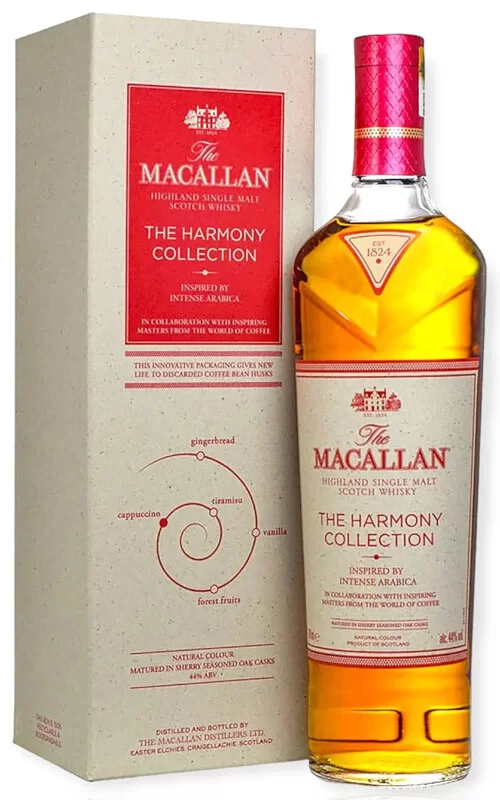 Intense Arabica è l’ultimo imbottigliamento della Harmony Collection, una limited release annuale guidata dallo spirito di ricerca di Macallan; ispirata al chicco di Arabica etiope, la prima specie di caffè a essere coltivata, subisce un invecchiamento avviee in botti di rovere americano ed europeo ex-Sherry accuratamente selezionate, che richiamano un espresso dolce ma forte. Ci accoglie al naso con sentori ricchi di mandorle, vaniglia, uvetta, tiramisù, cappuccino e rovere dolce, per un sorso dove prevalgono note di uvetta, cioccolato fondente, vaniglia e more, verso un finale persistente ed equilibrato con sfumature di caffè tostato.