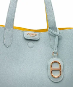Borsa shopper di TWINSET ‘Everywhere’ reversibile effetto pelle di vitello a grana naturale bicolore doppiata e sfoderata. Doppio manico a spalla, la chiusura con magnete, il logo lettering e charm rimovibile con Oval T in metallo con galvanica oro. Contiene una pochette con zip e logo, foderata, che può essere usata come busta interna legata alla shopper mediante il moschettone, oppure separatamente come clutch.