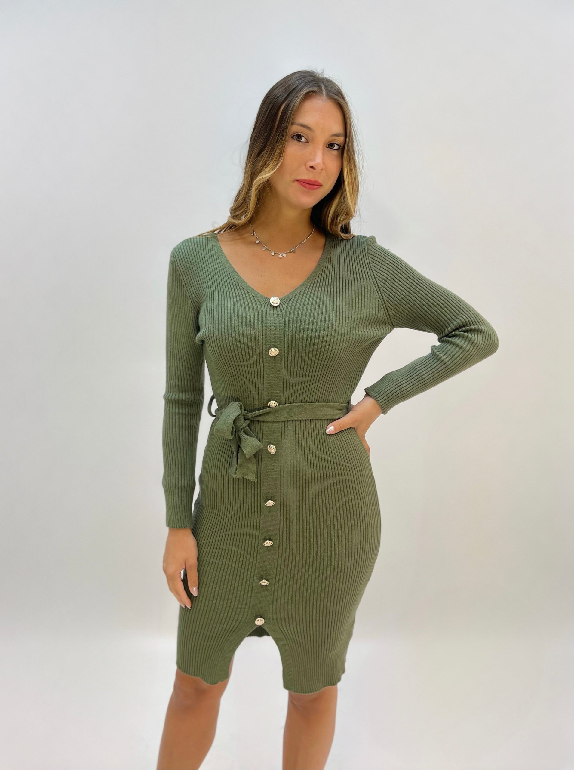 Abito a costine con bottoni e cintura.