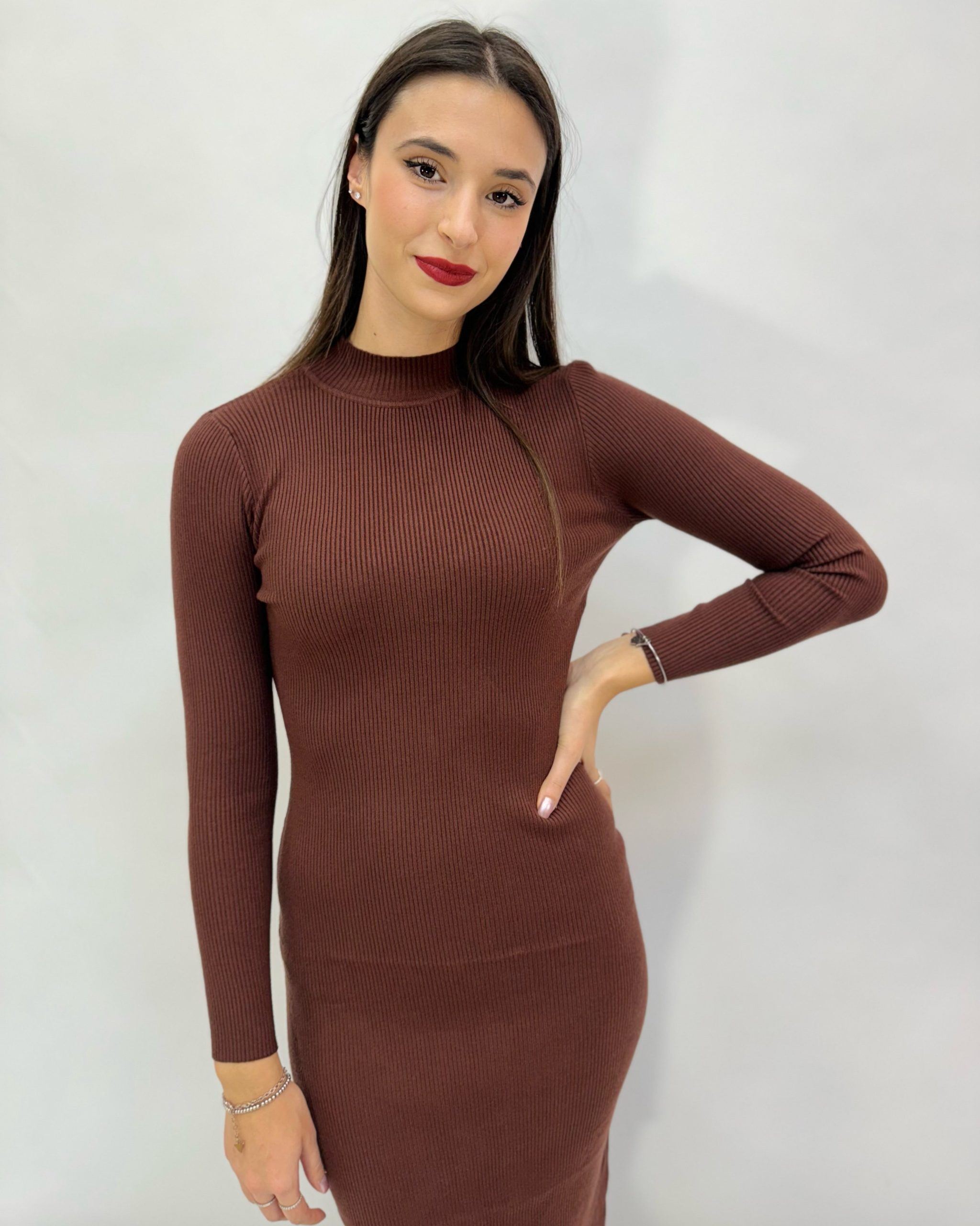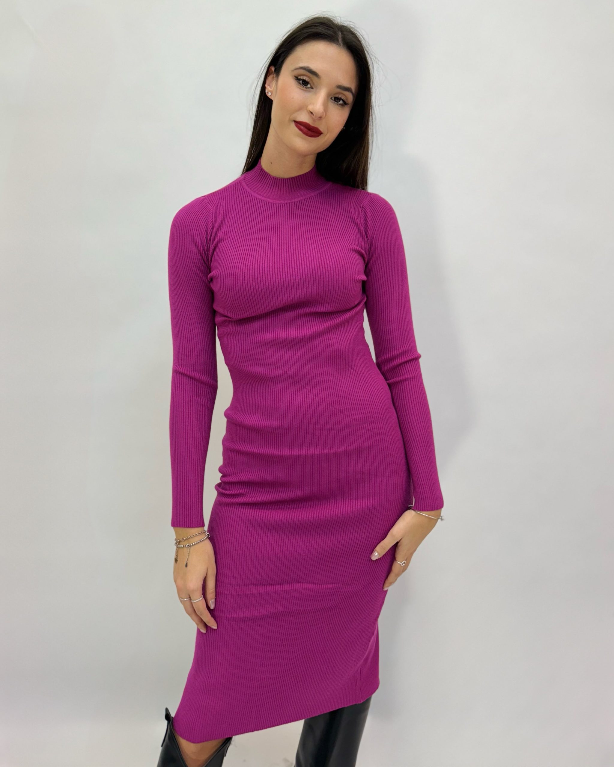 Abito lungo a costine aderente. Veste slim. Dettaglio spacco dietro.