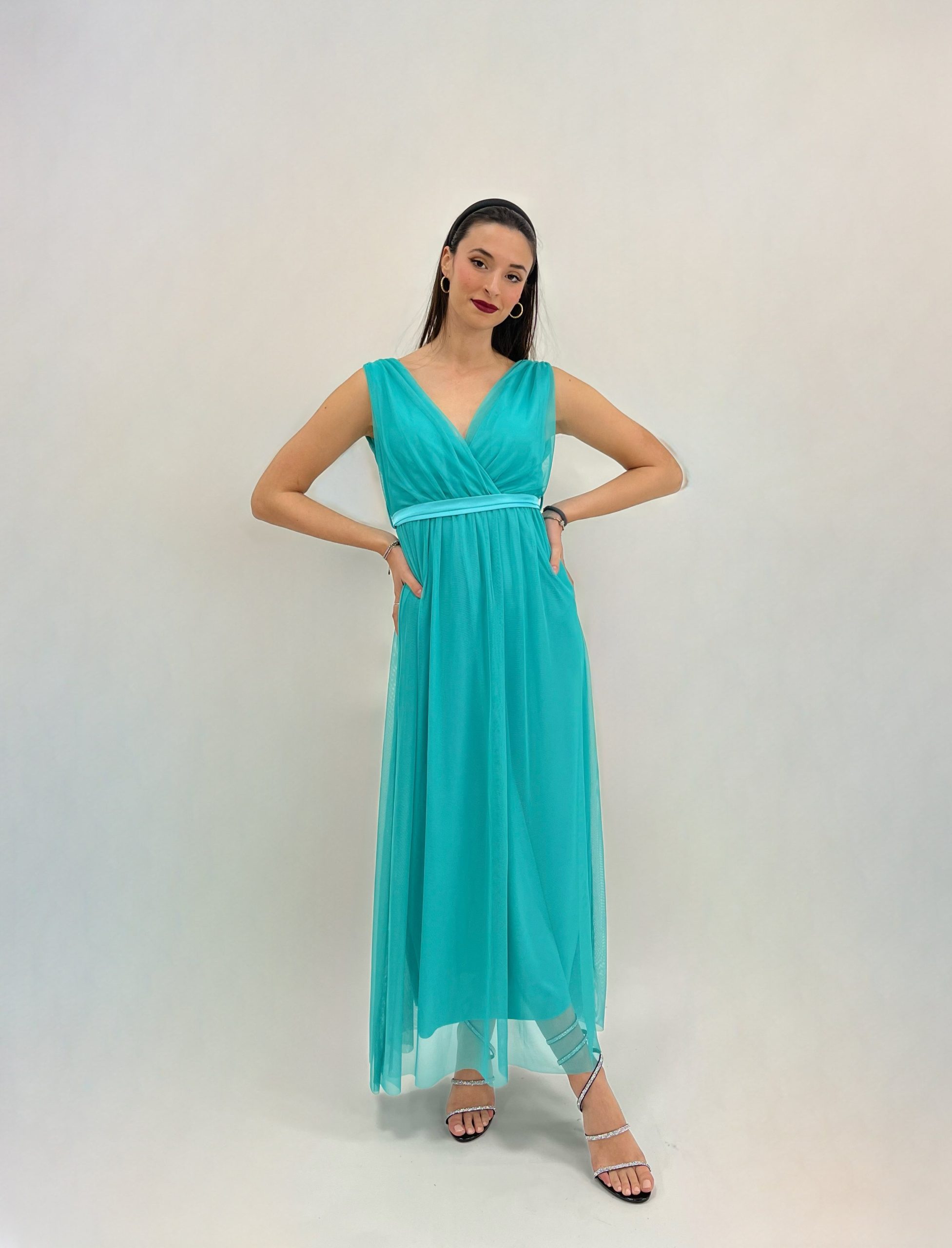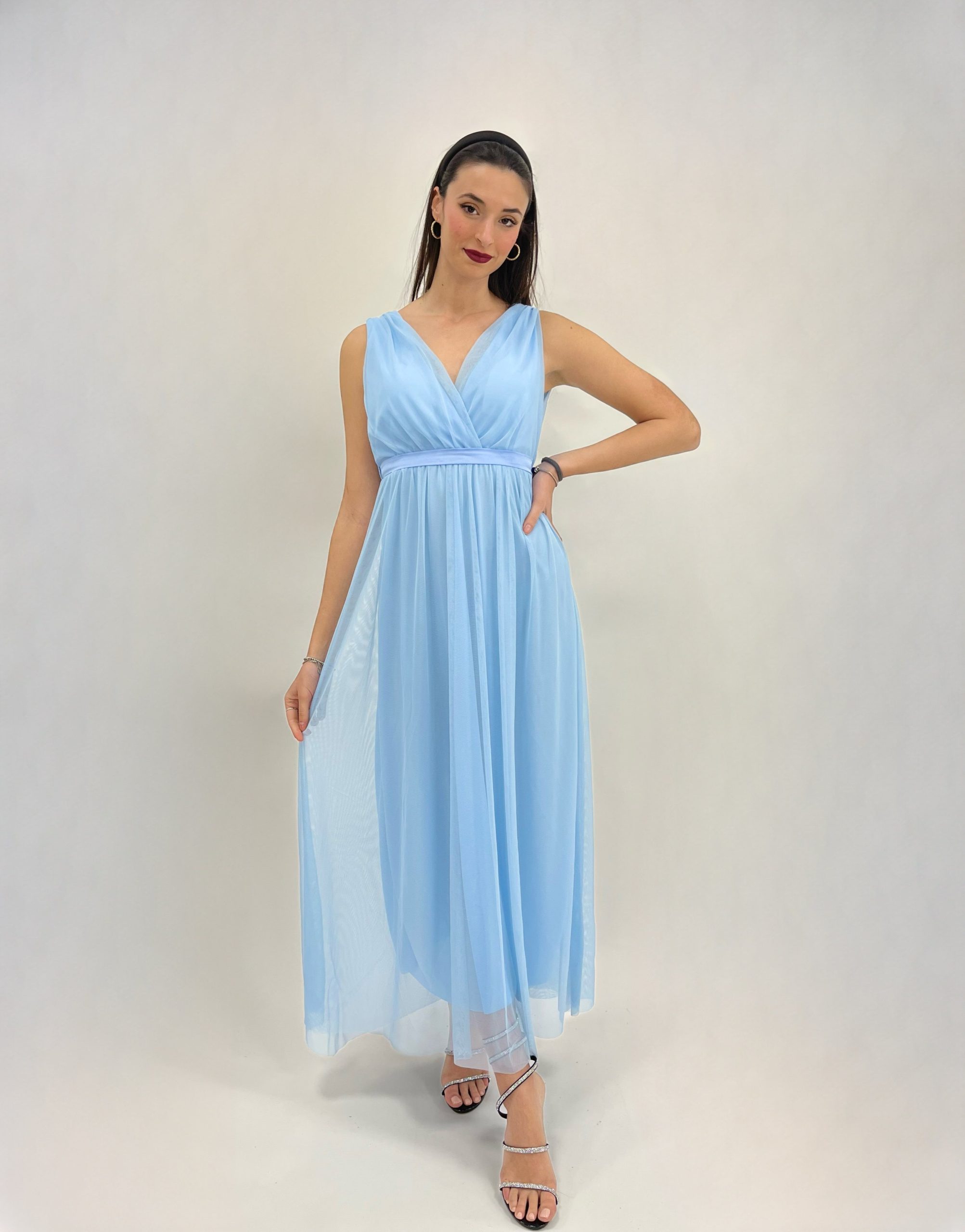 Ariel è un abito romantico in tulle che sottolinea gusti eleganti. Abito con scollo a V presenta una gonna lunga. Con coppe preformate e fascia in vita tessuto su tessuto. Elastico sul corpetto. Veste bene fino la 46.