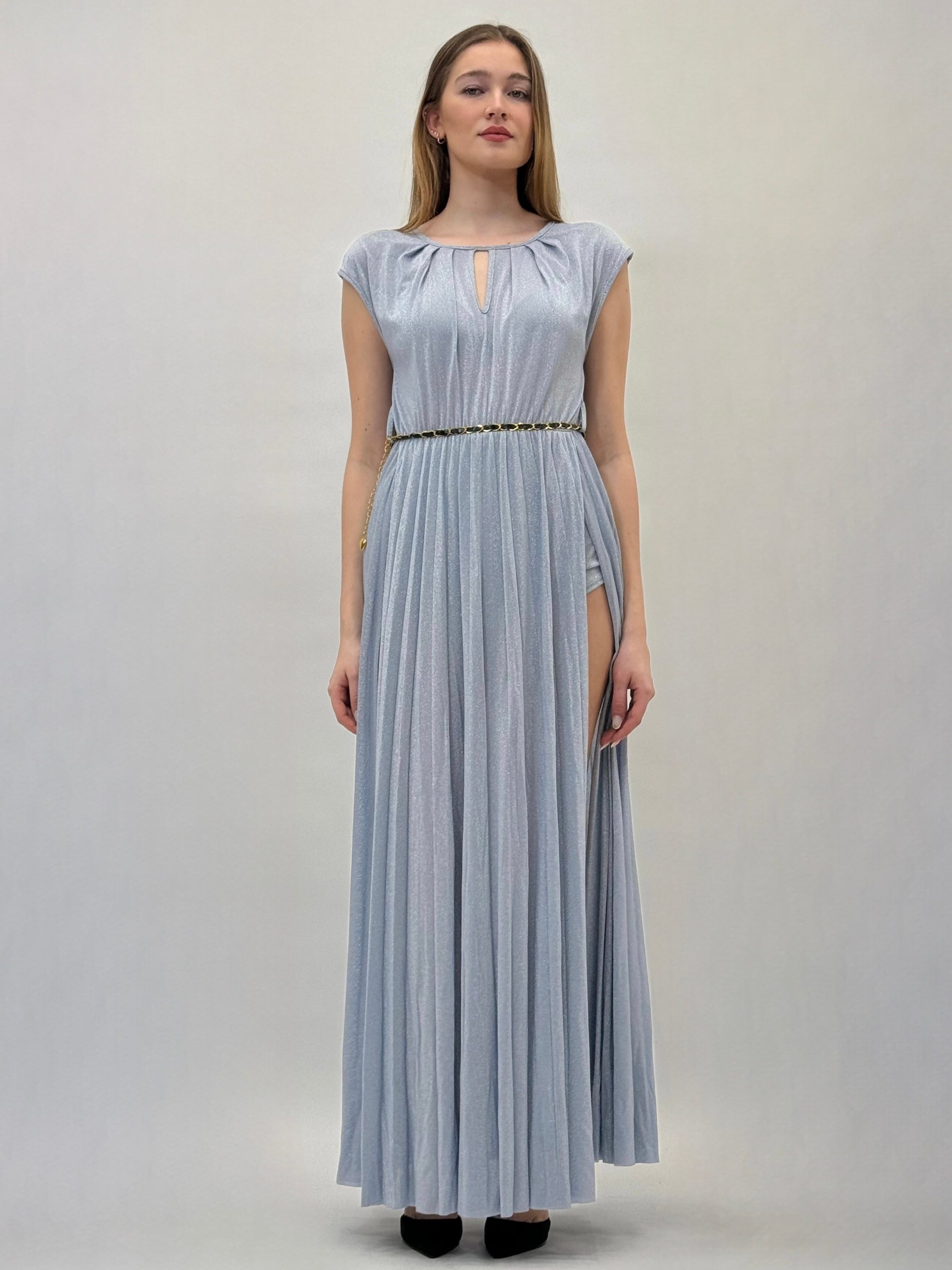 Abito lungo con spacchi laterali. Con pantaloncino. Veste elasticizzato. Cintura in vita regolabile.