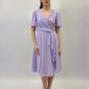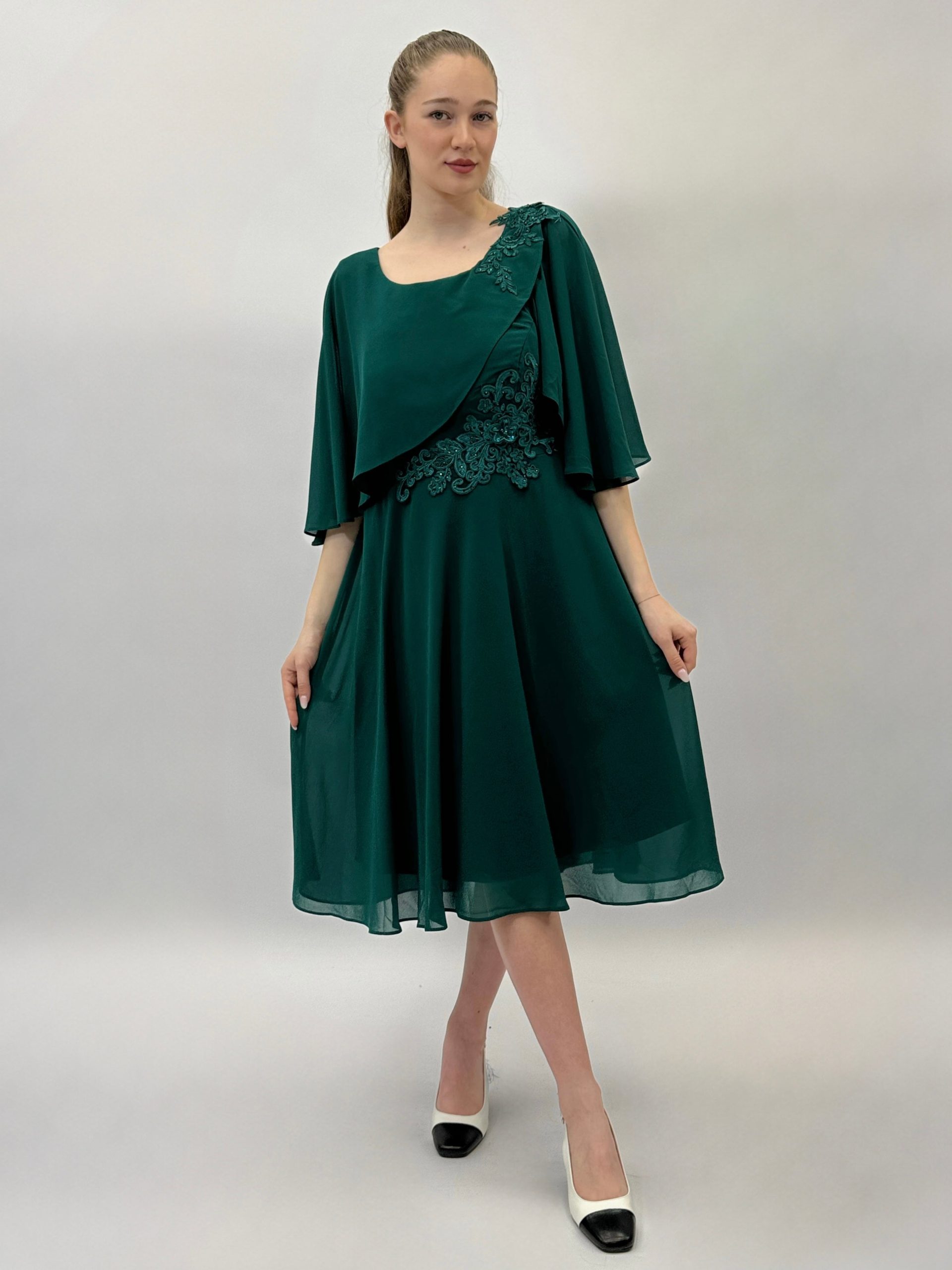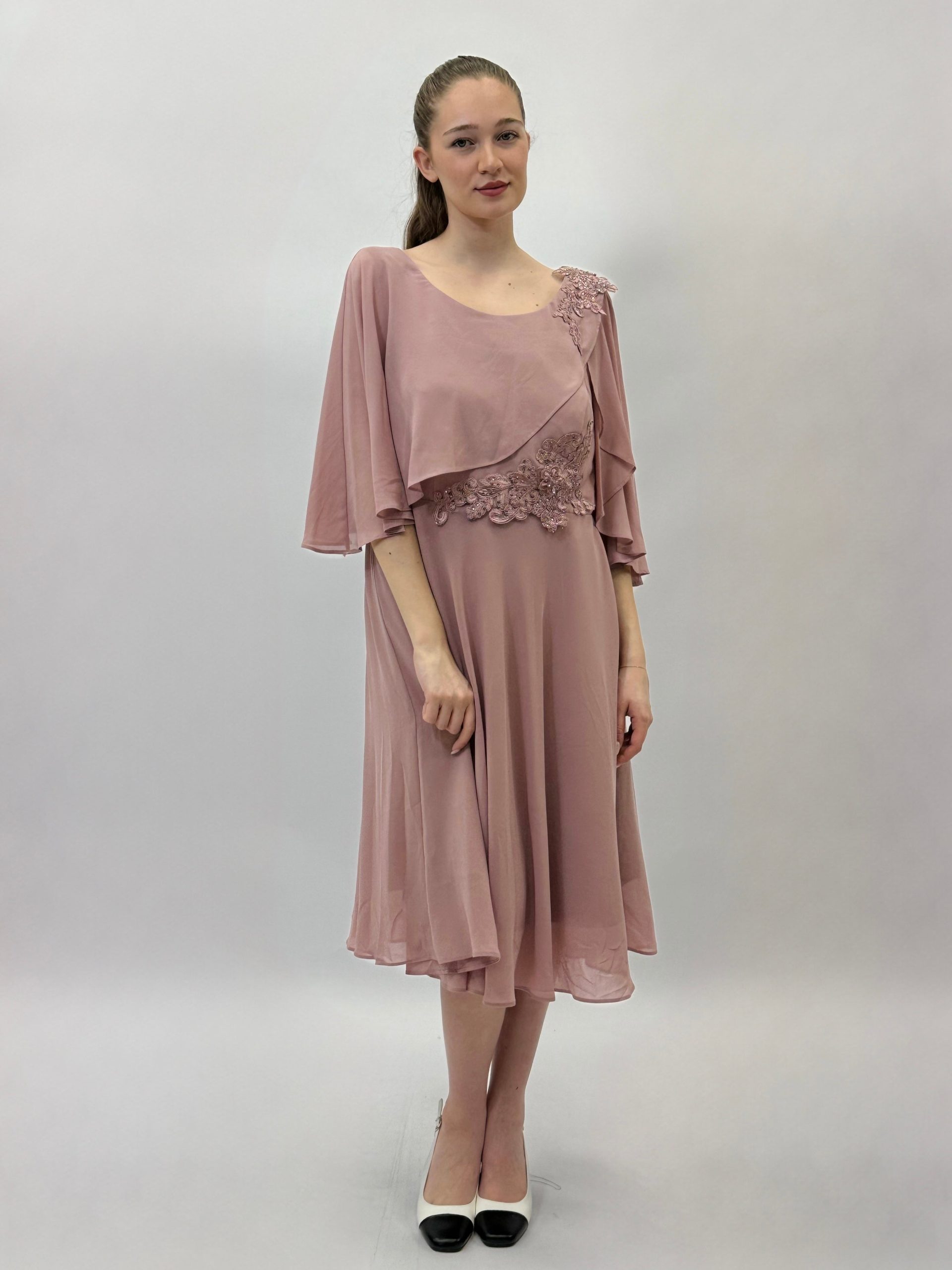 Abito taglia comoda con drappo laterale. Dettaglio pizzo.