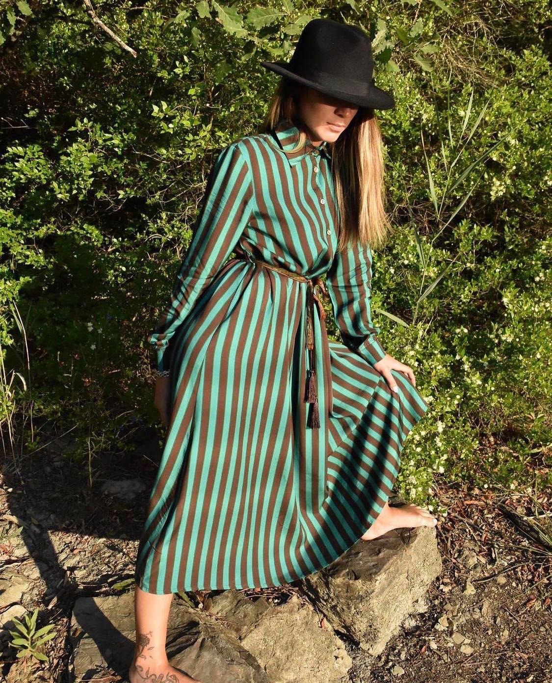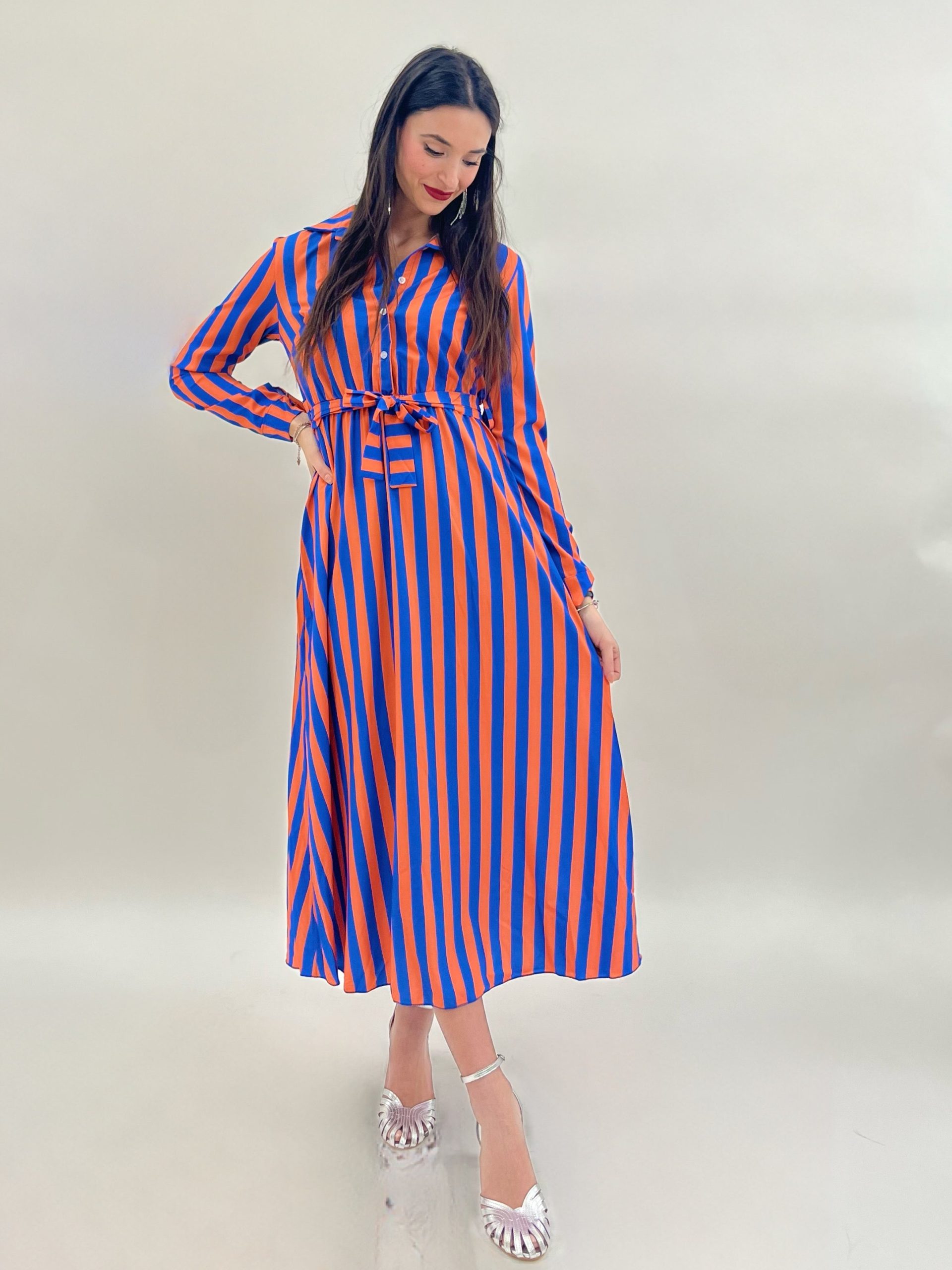 Abito con fantasia a righe bicolore con vita elastica e cintura. Bottoni fino alla vita.