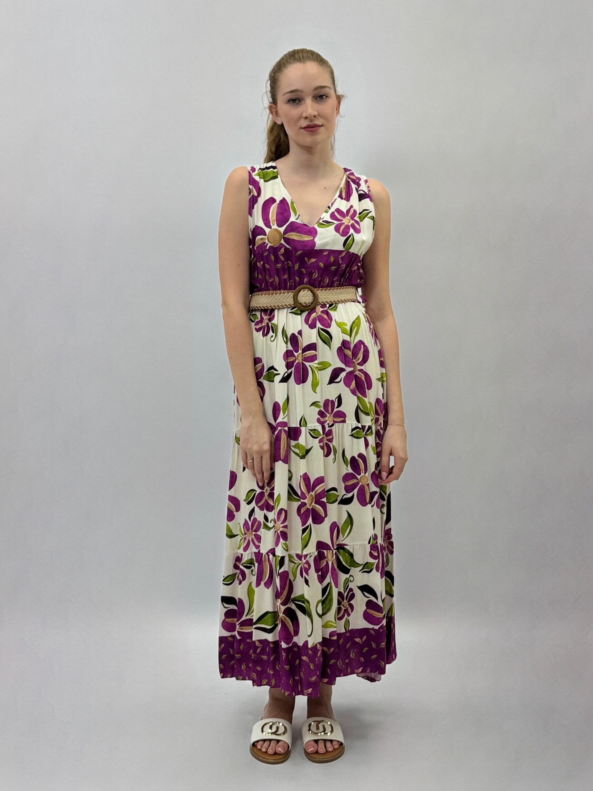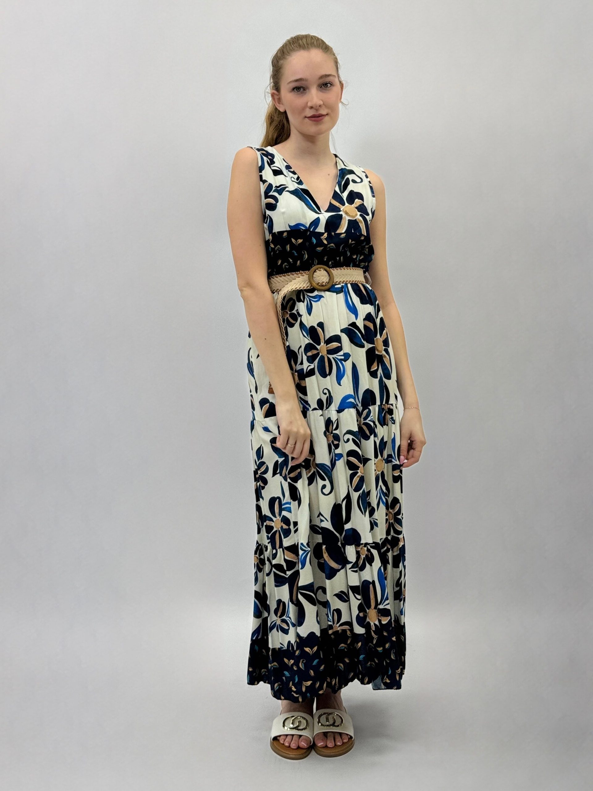 Abito con fantasia e cintura.