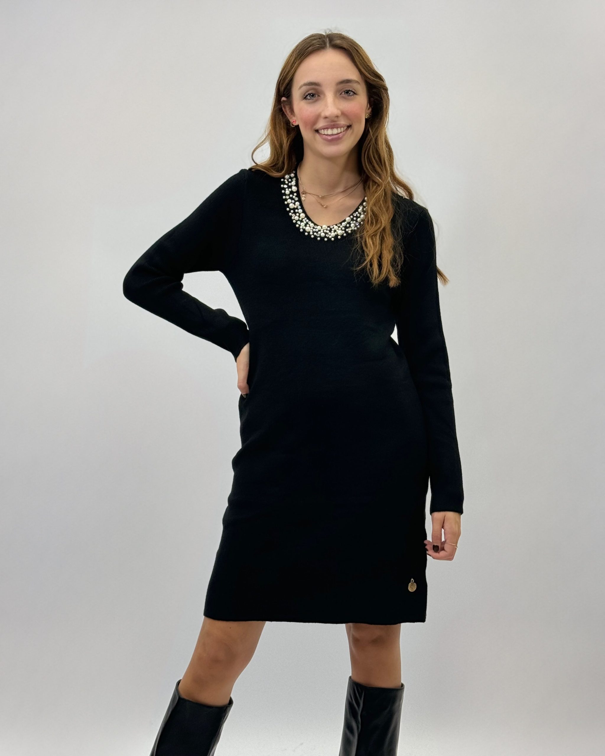 Abito con dettaglio gioielli sul collo. Veste elasticizzato.