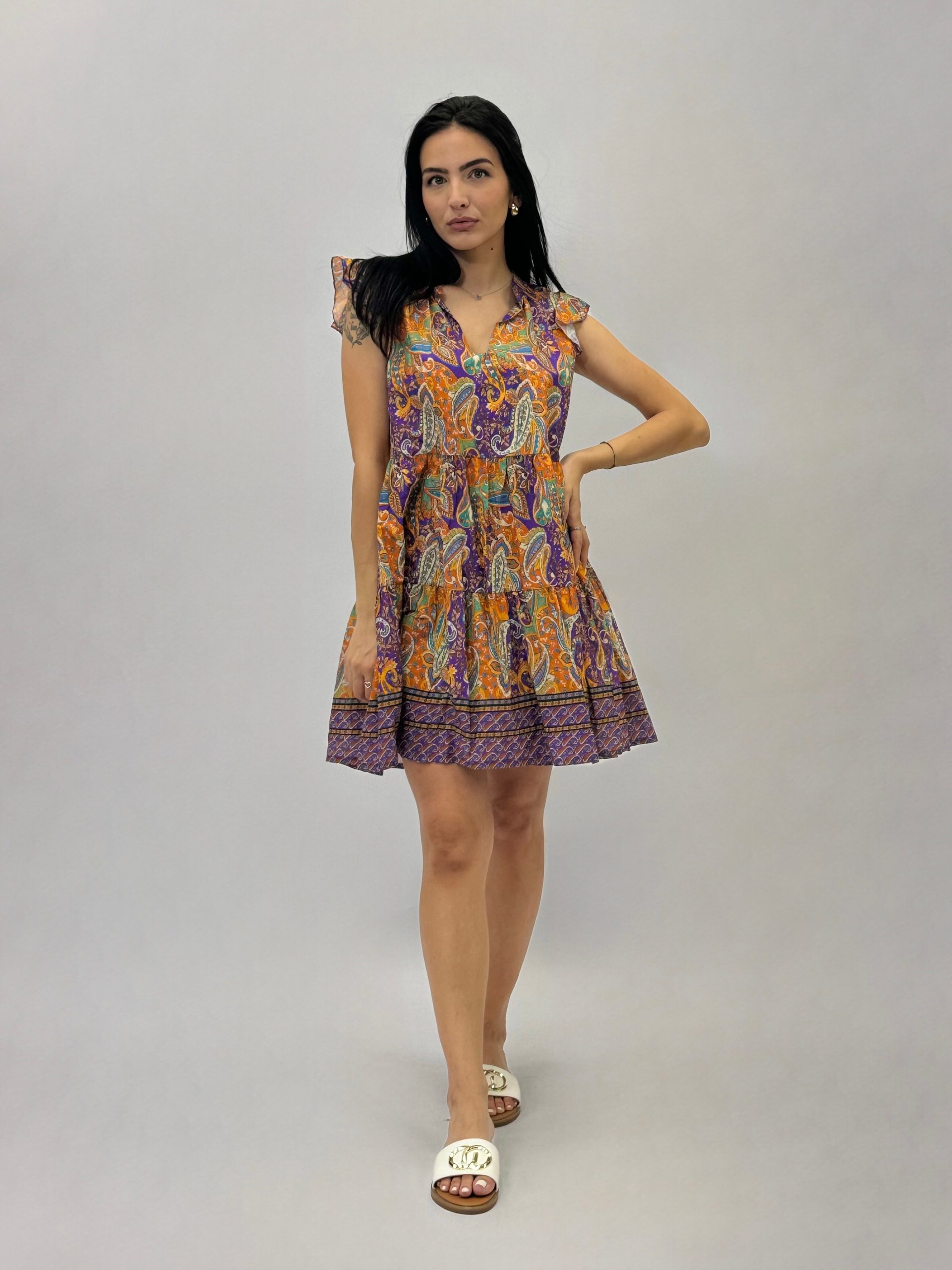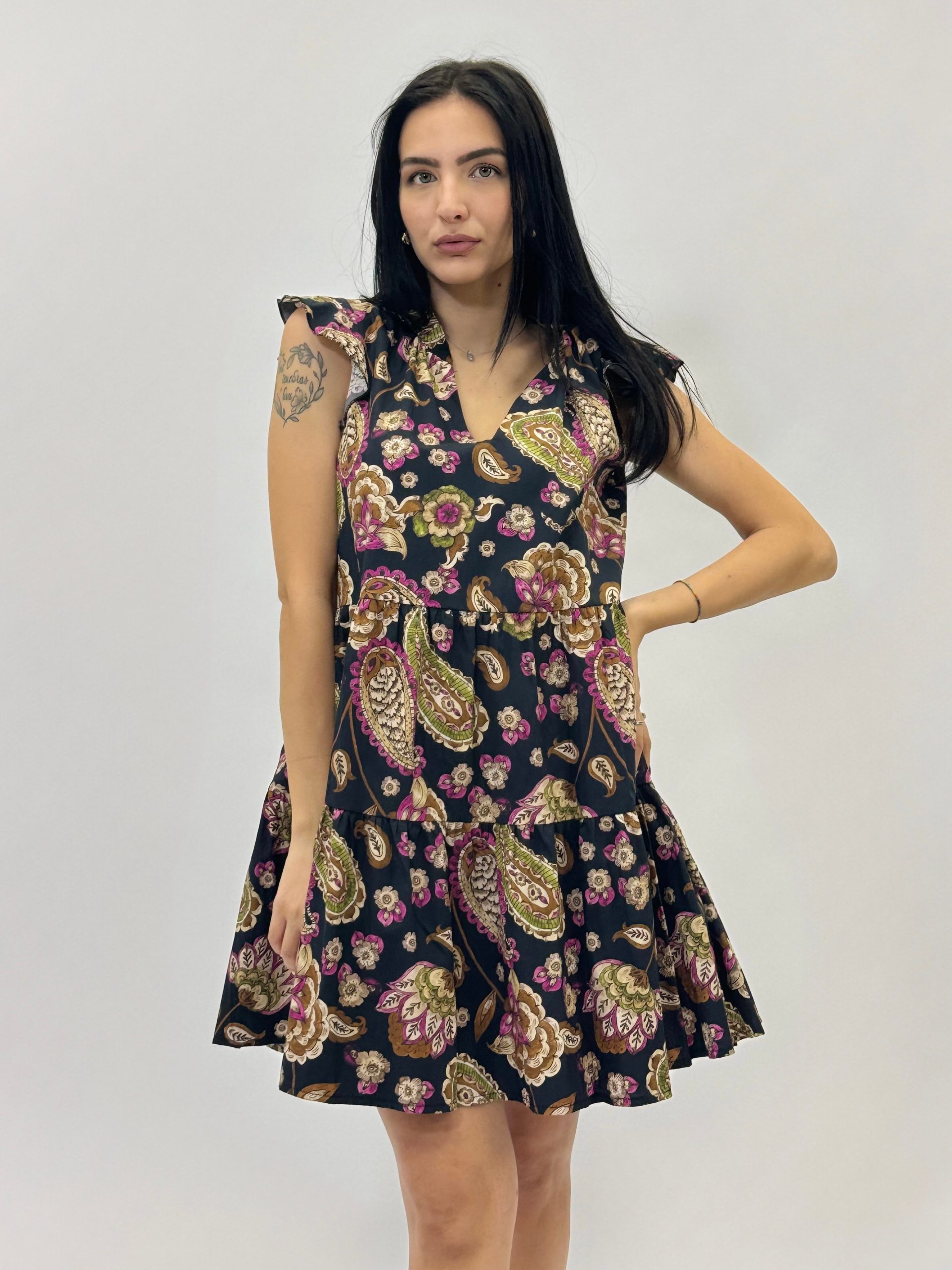 Abito con maniche a volant con fantasia indie corto. Scollo alla coreana.