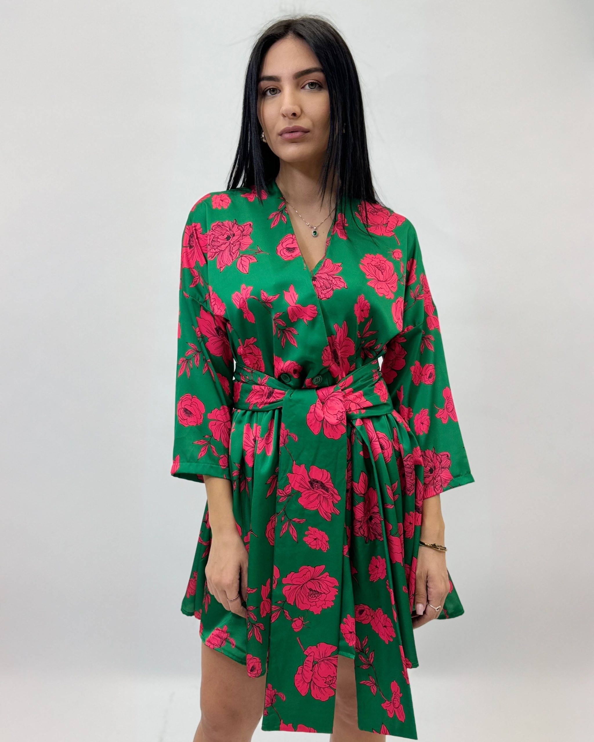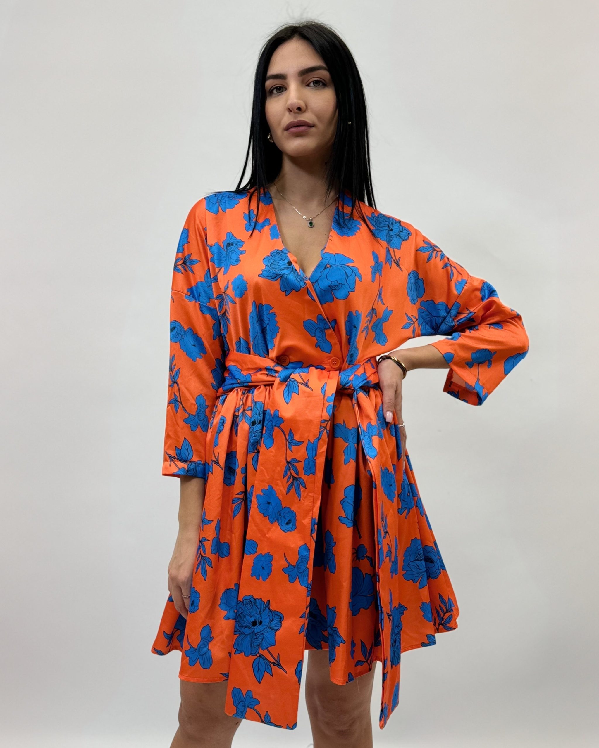 Abito a portafoglio con bottoni e fascia in vita disponibile in bellissime fantasie con rose all’ultima moda! Taglia unica