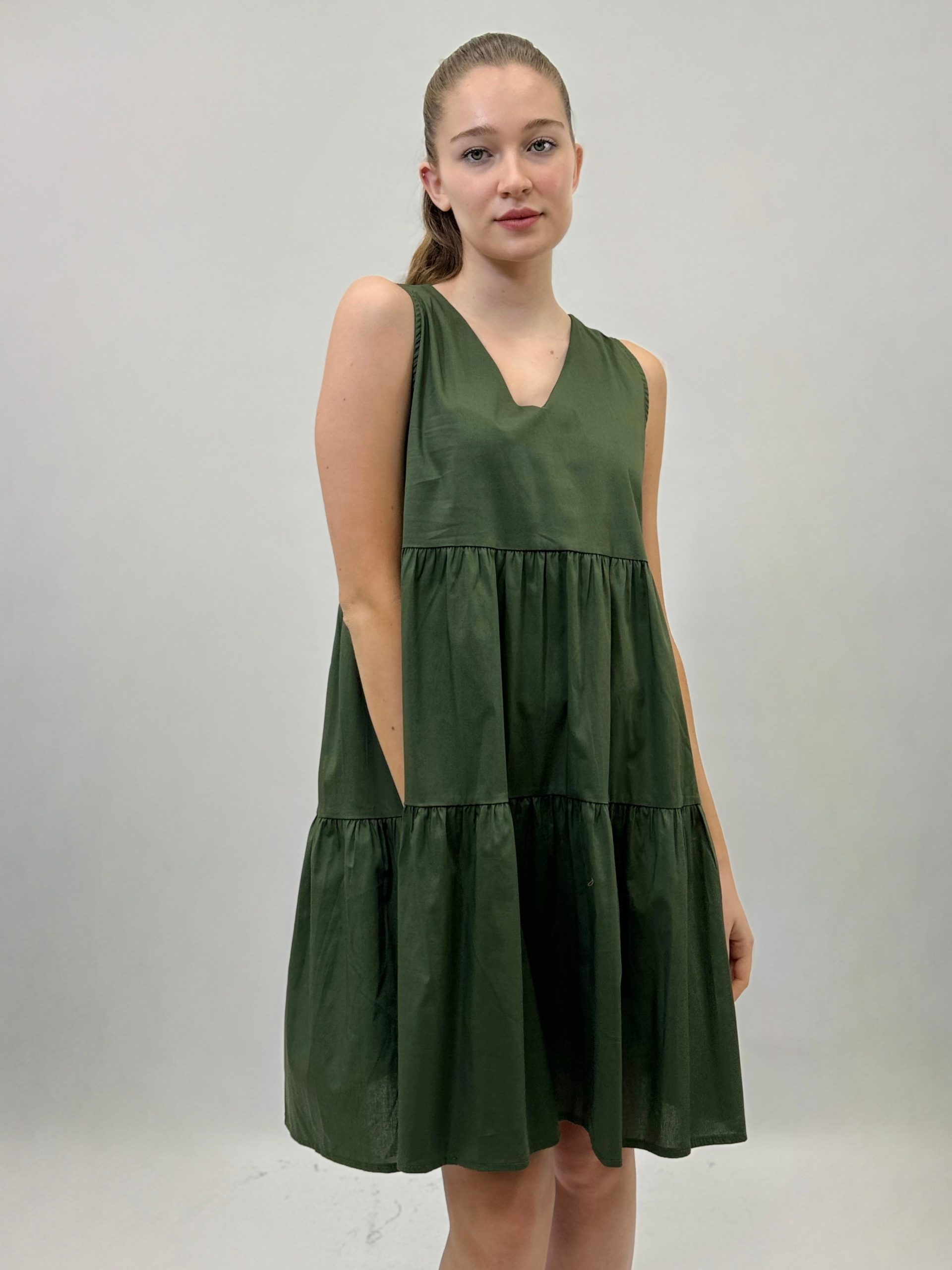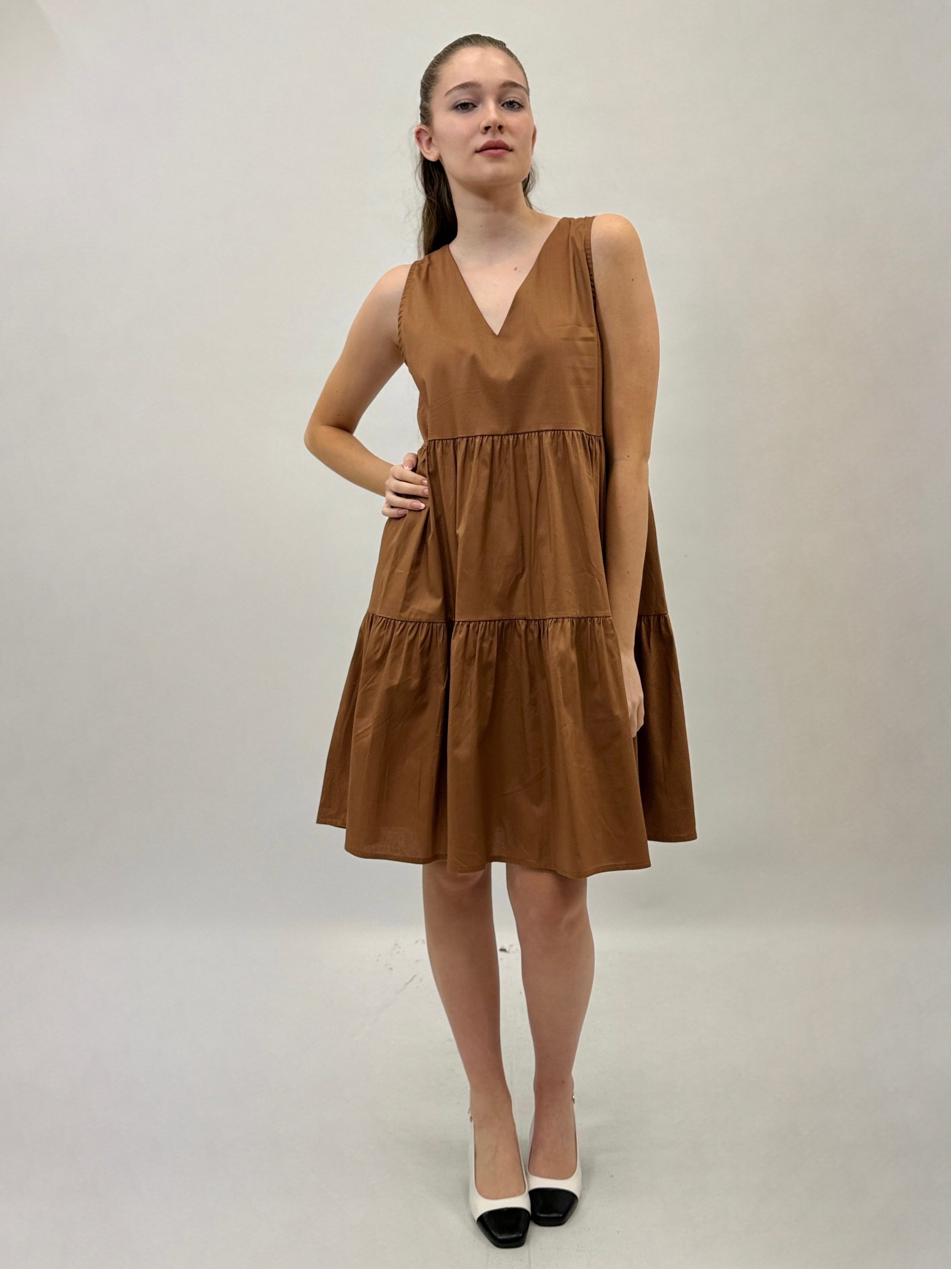 Abito con scollo a V e balze. Smanicato.