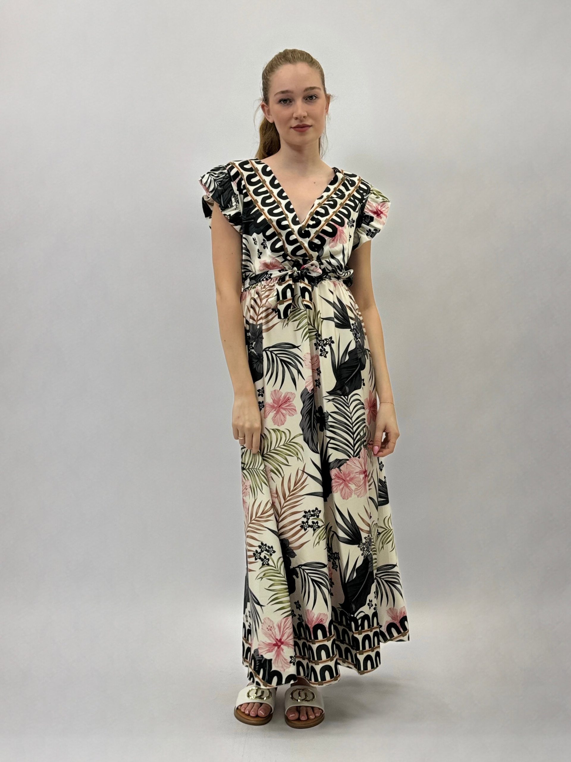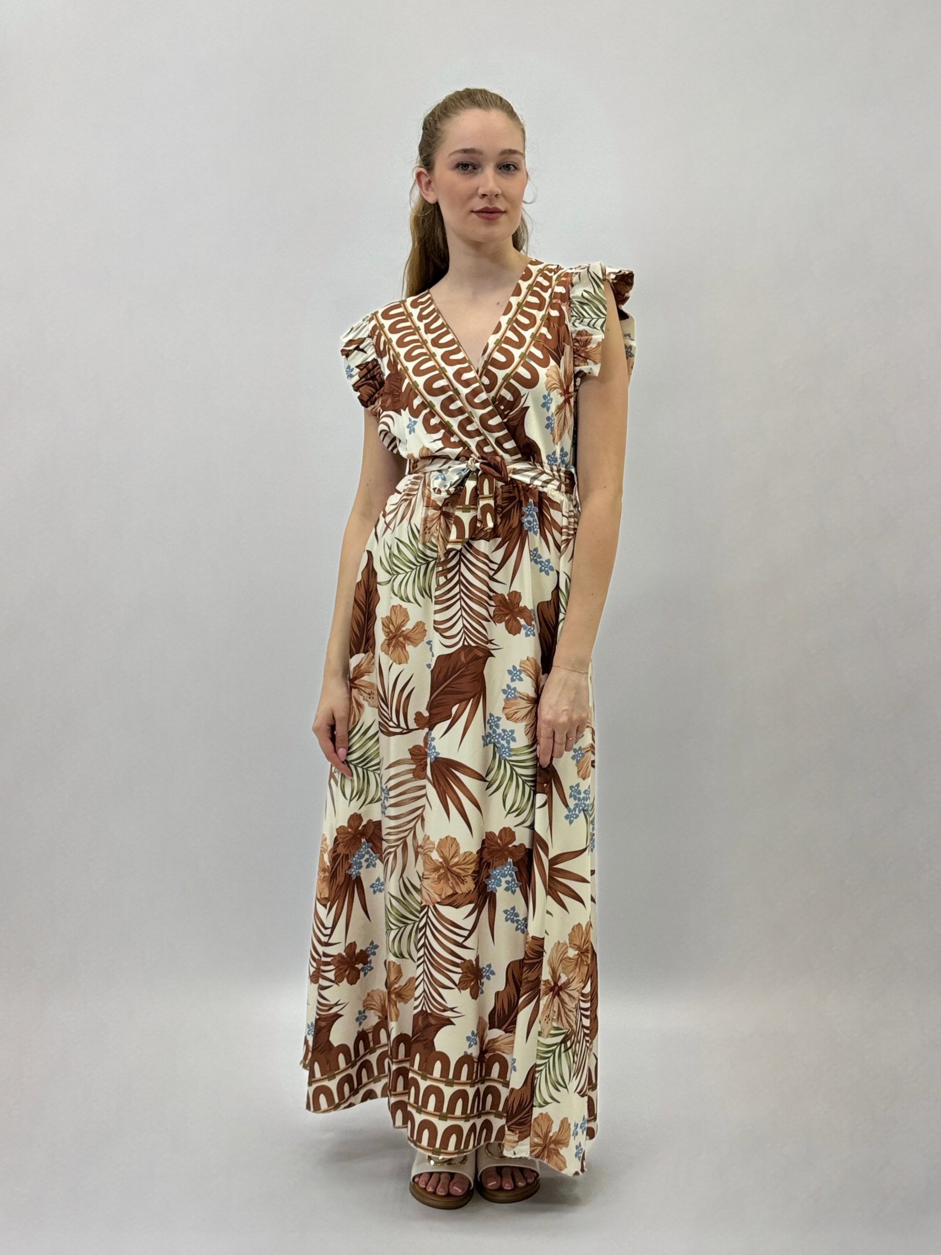 Abito con scollo a V e maniche a volant con dettaglio cintura.
