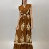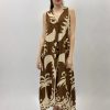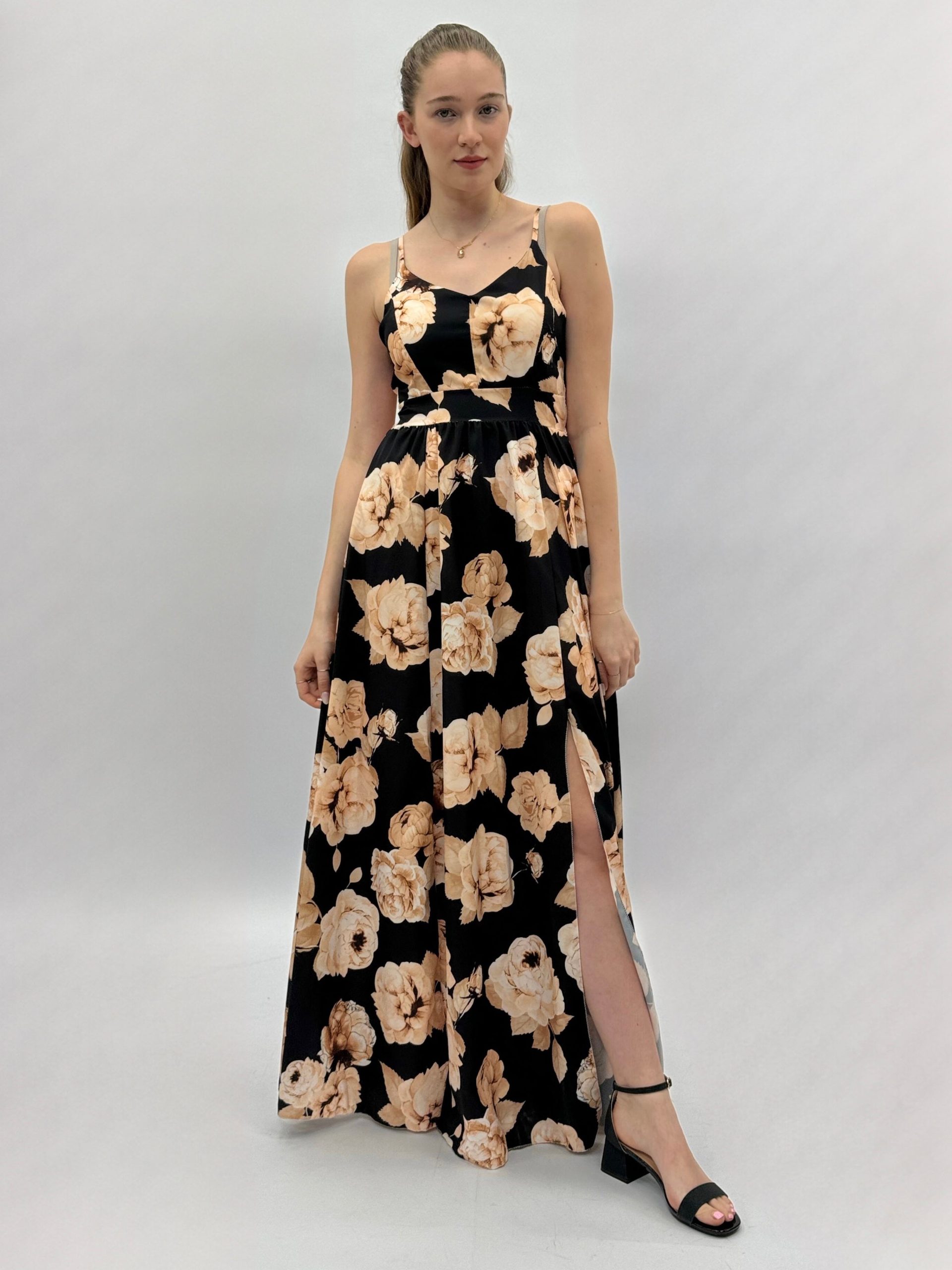 Abito con spacco floreale e spalline. Elasticizzato. Gonna ampia.
