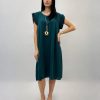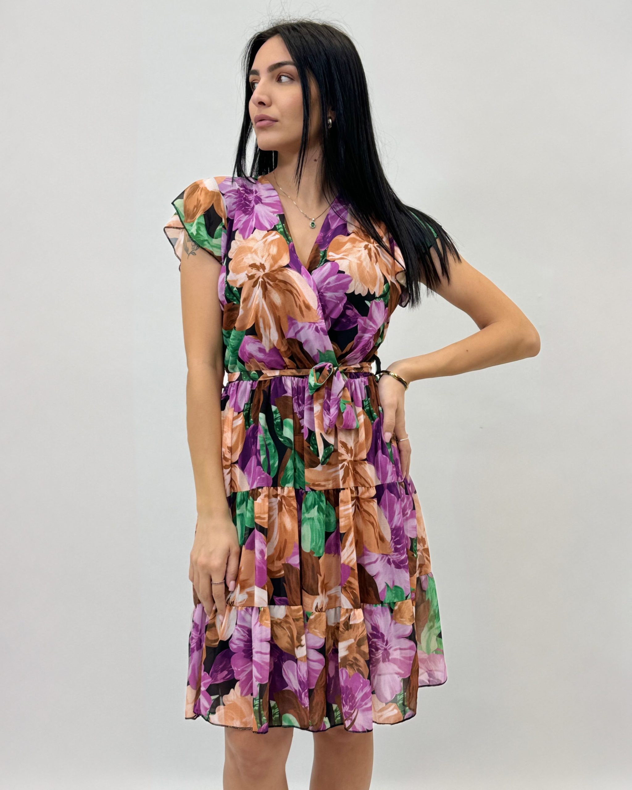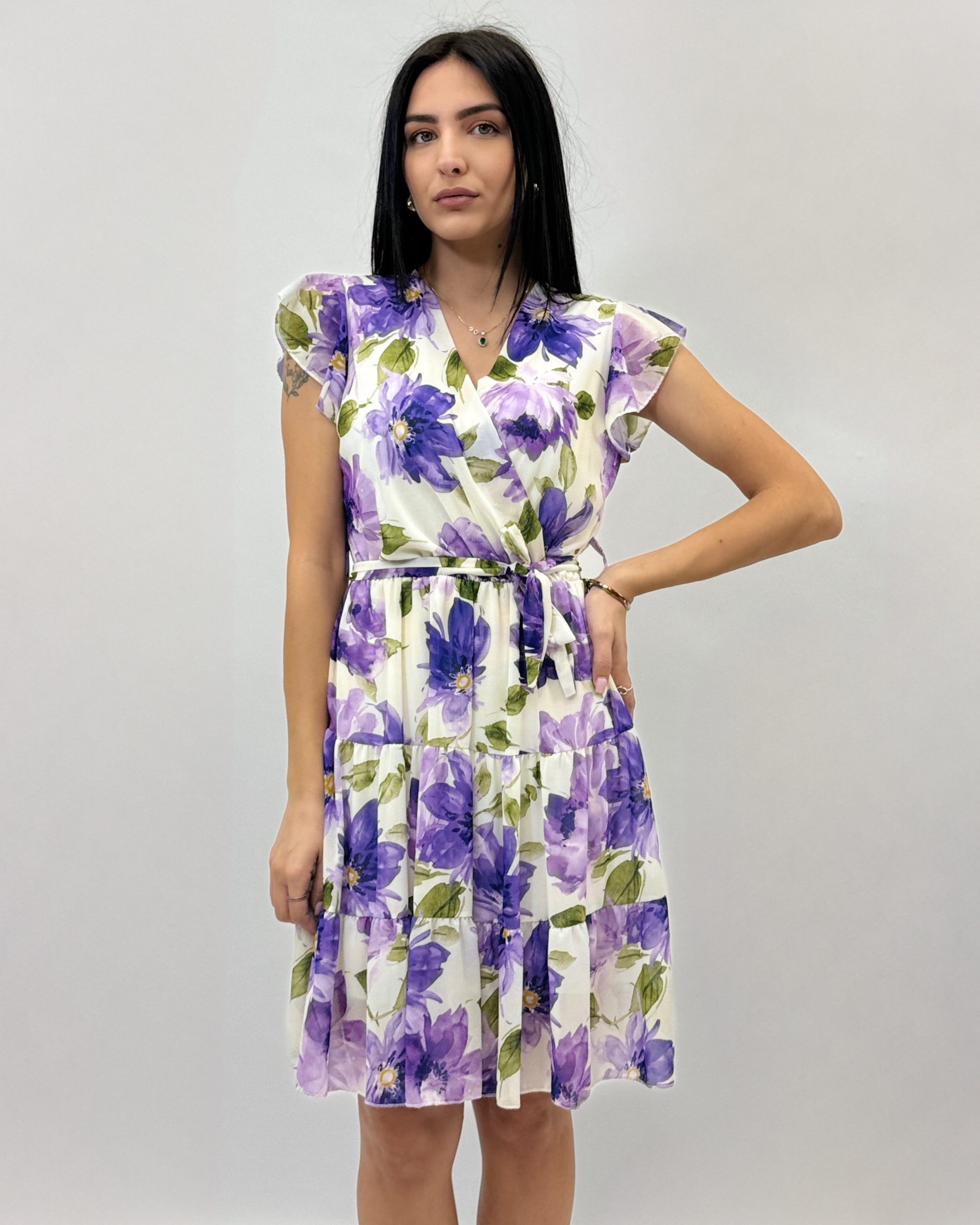 Abito corto con maniche volant. Scollo a V. Elasticizzato in vita.