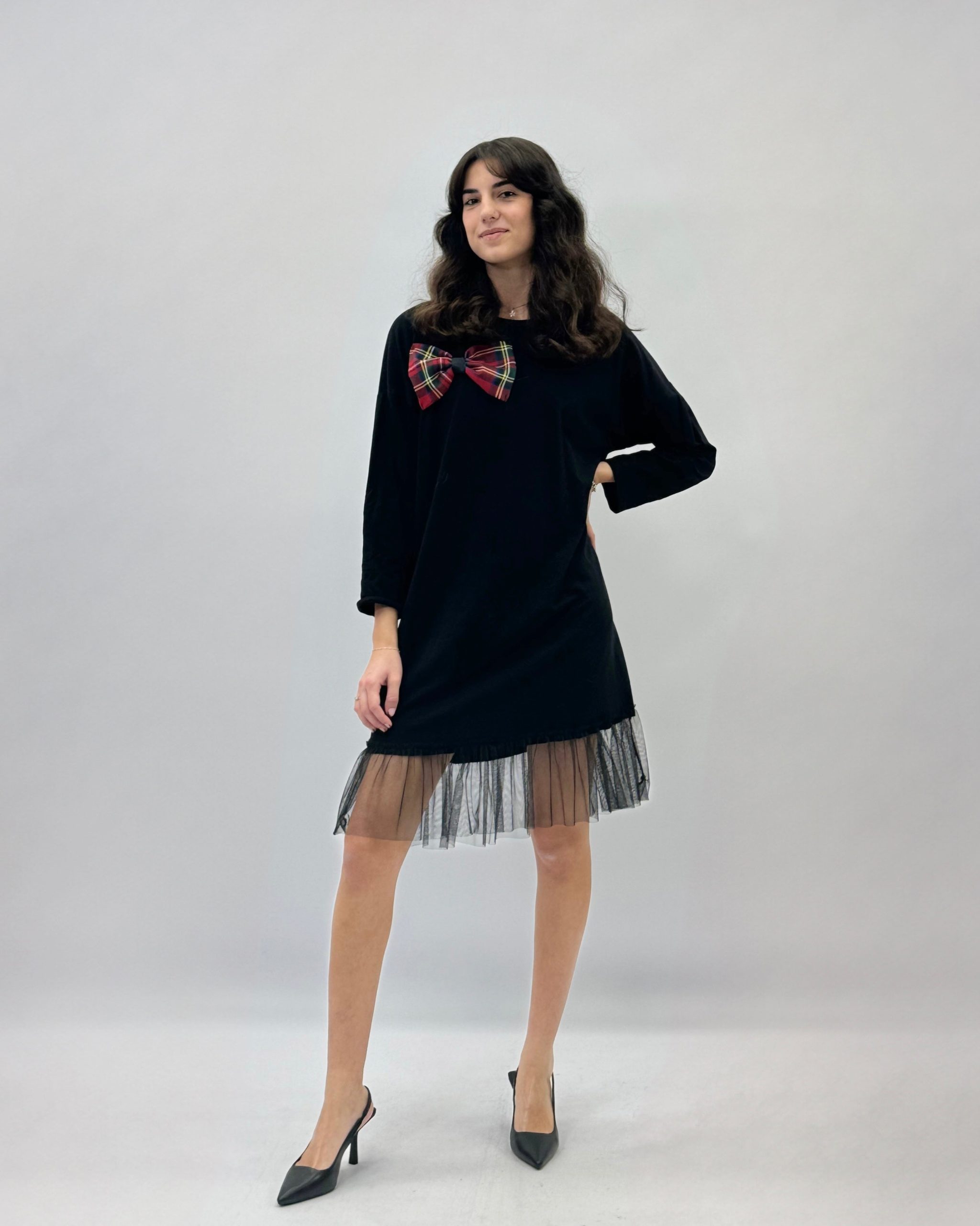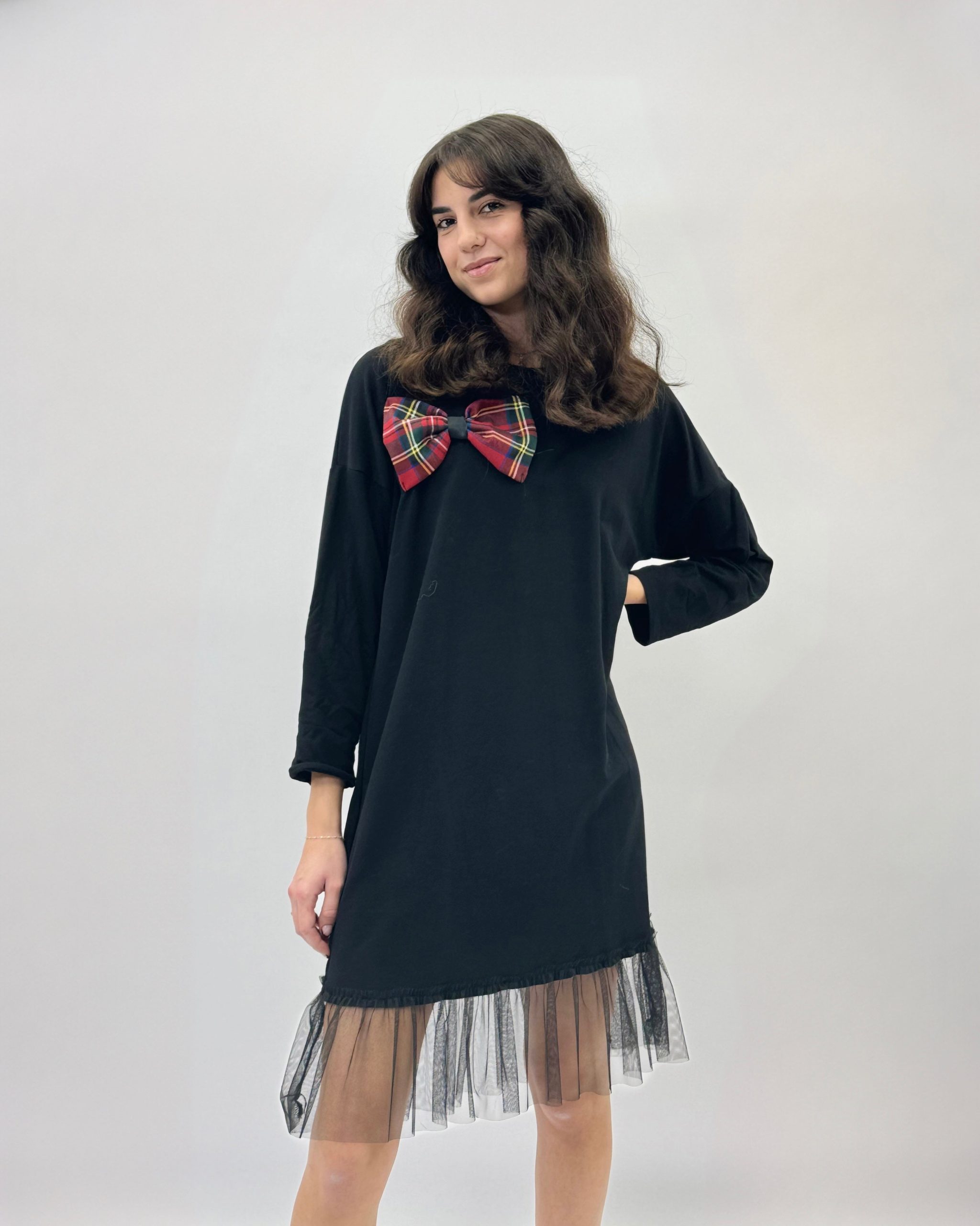 Abito lungo con fiocco tartan taglia comoda. Maniche lunghe. Veste ampio.