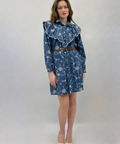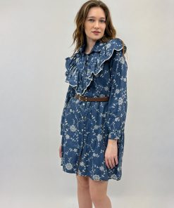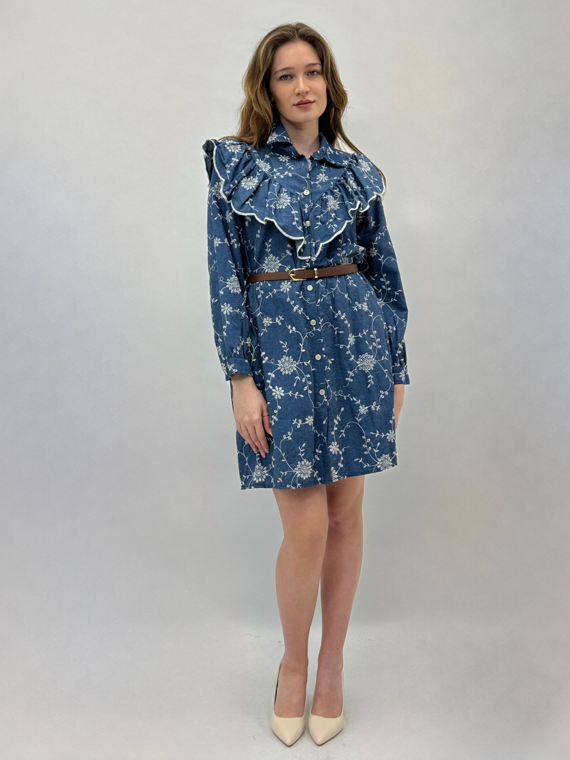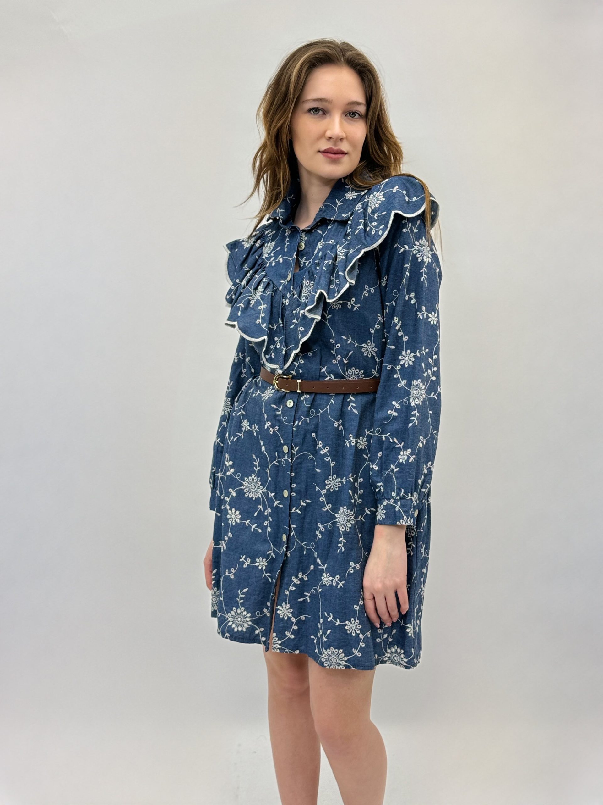 Abito in cotone con dettaglio volant e ricami. Dettaglio cintura. Maniche lunghe. Chiusura bottoni.