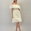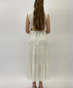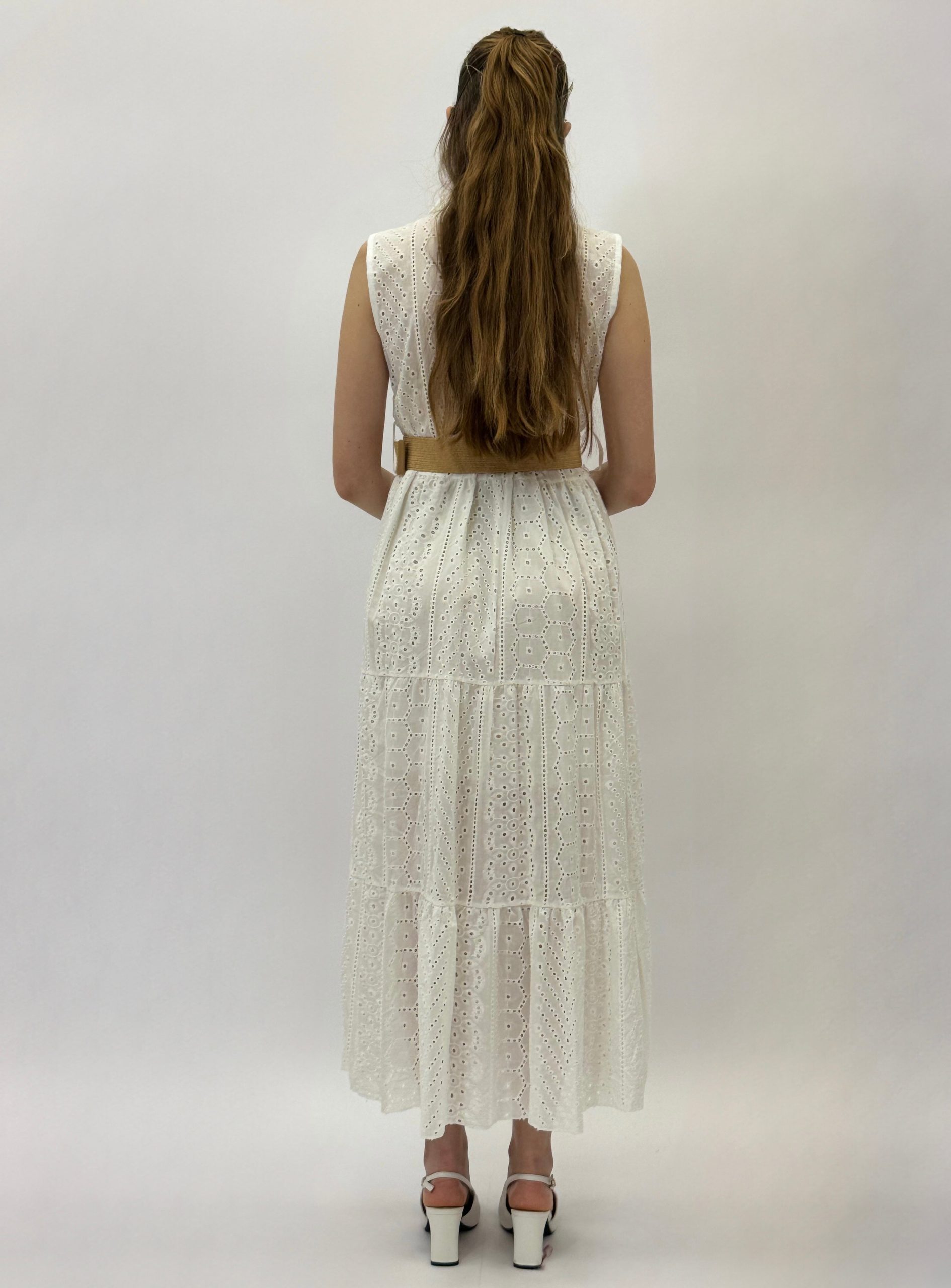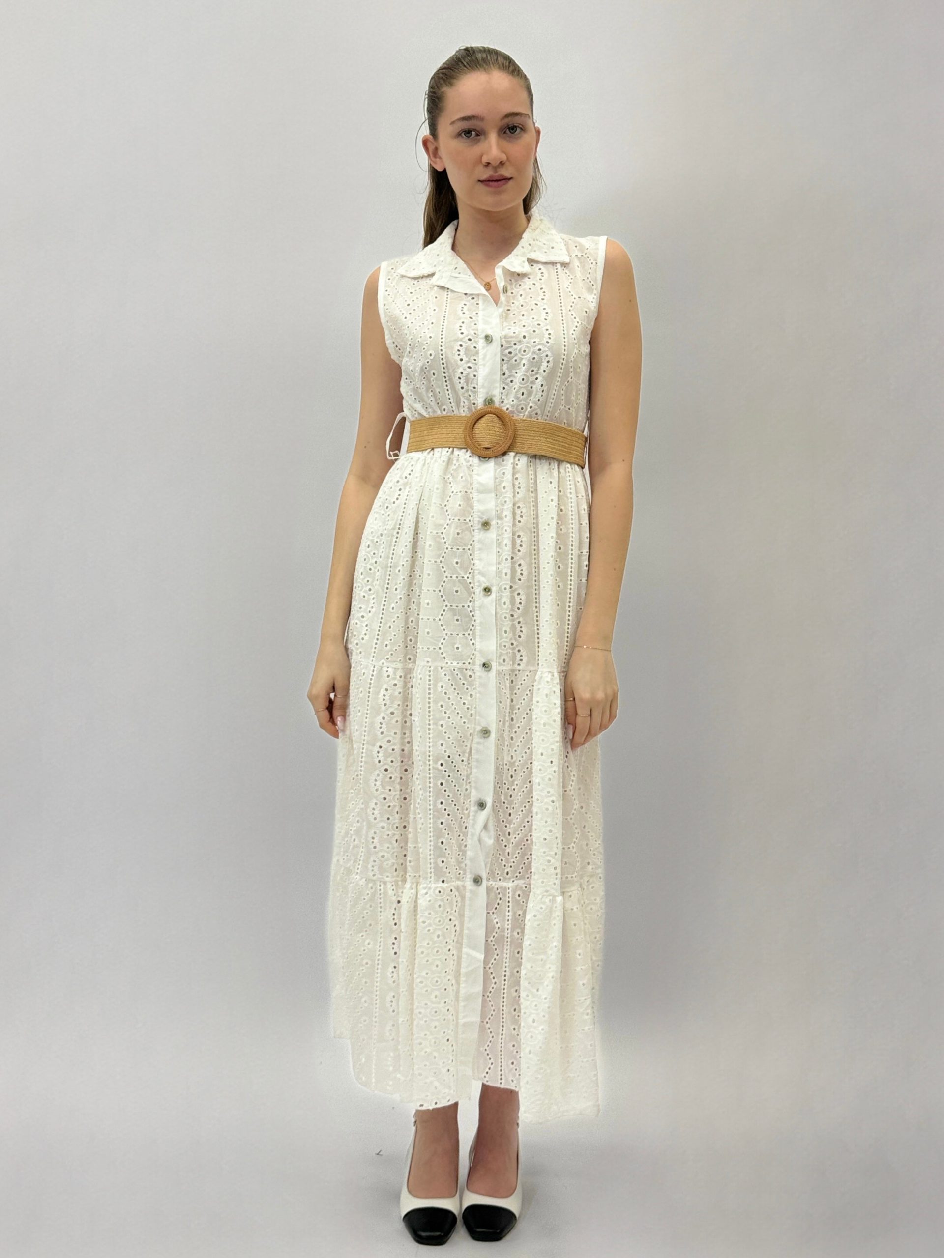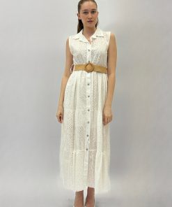 Abito in pizzo smanicato con dettaglio cintura.