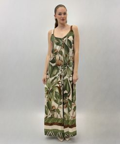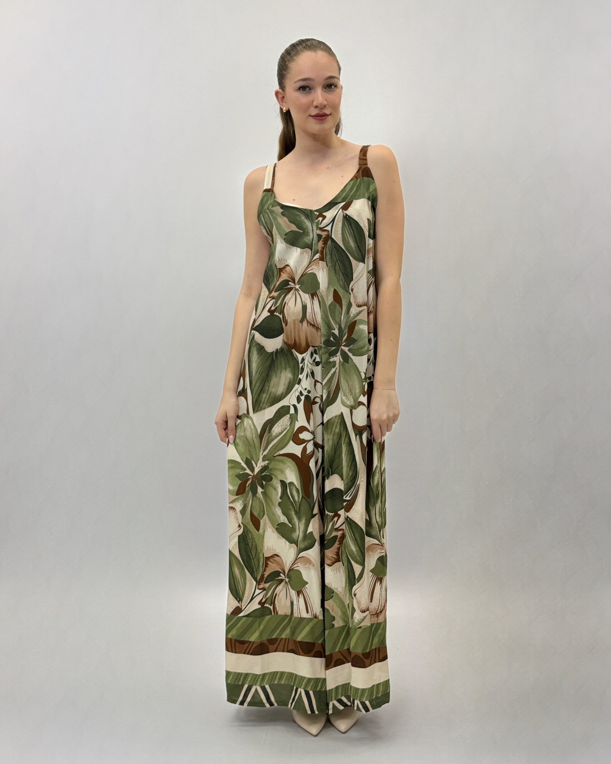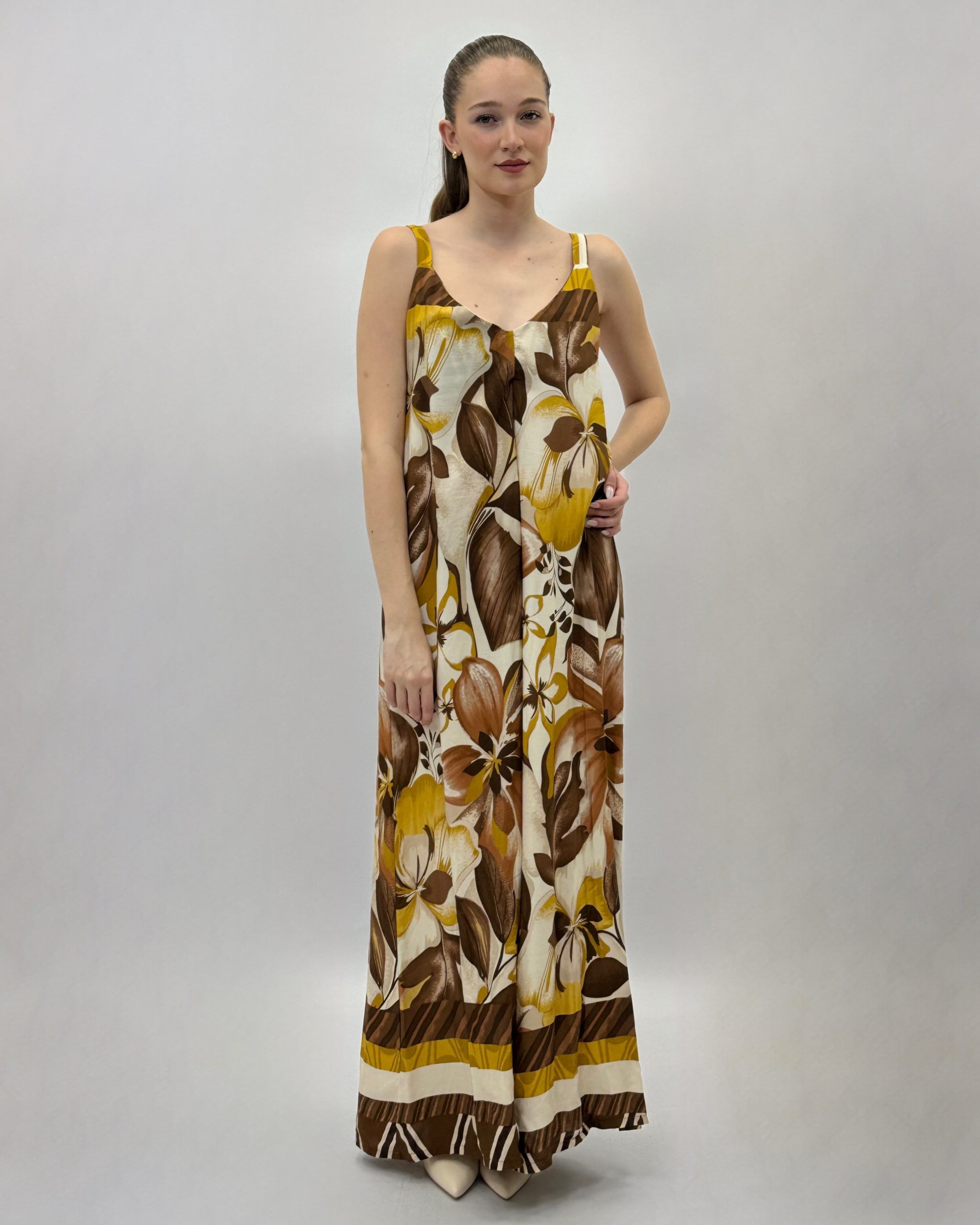 Abito lungo con spalline e fantasia floreale.