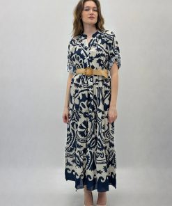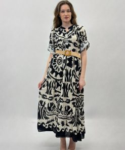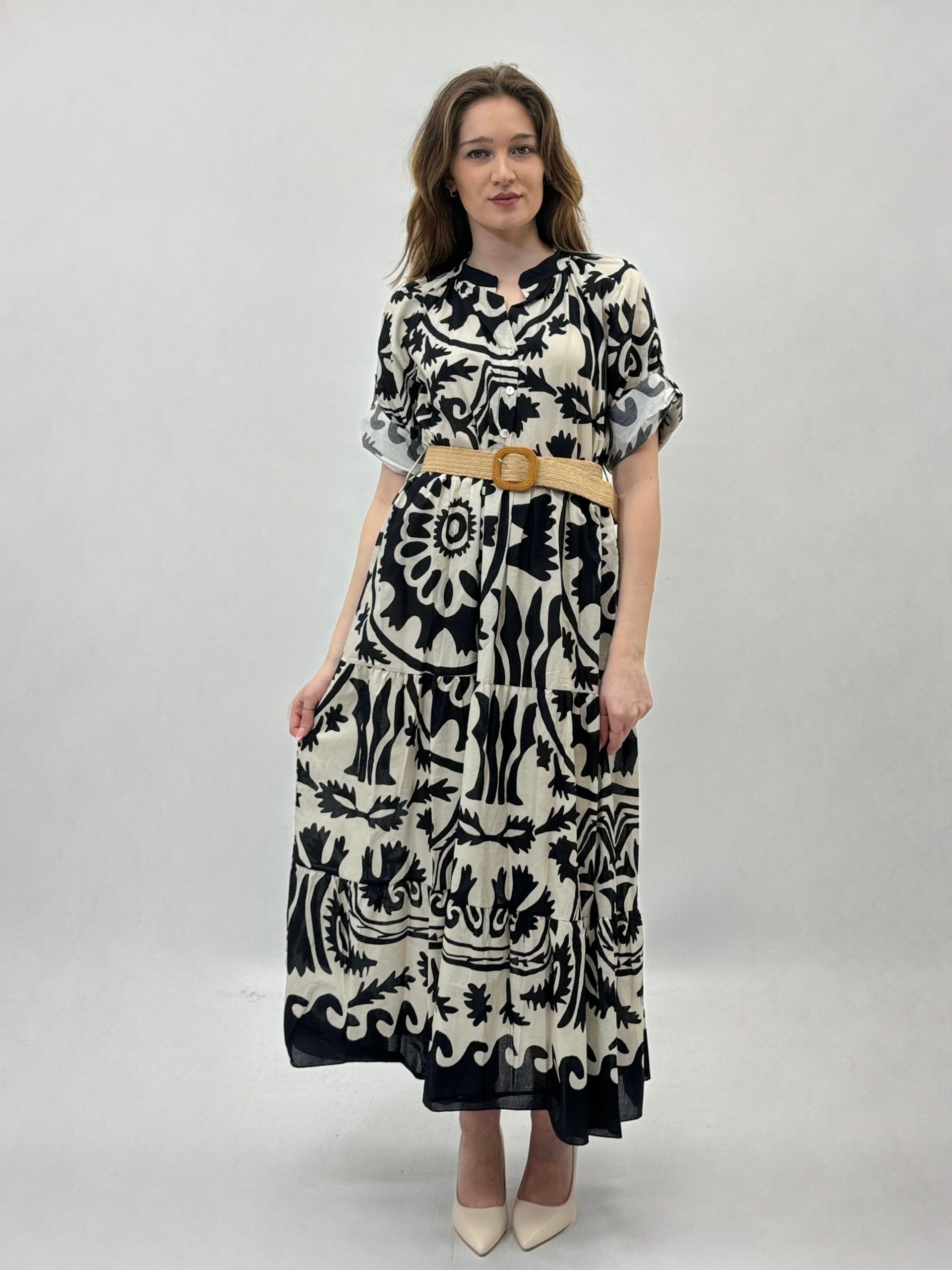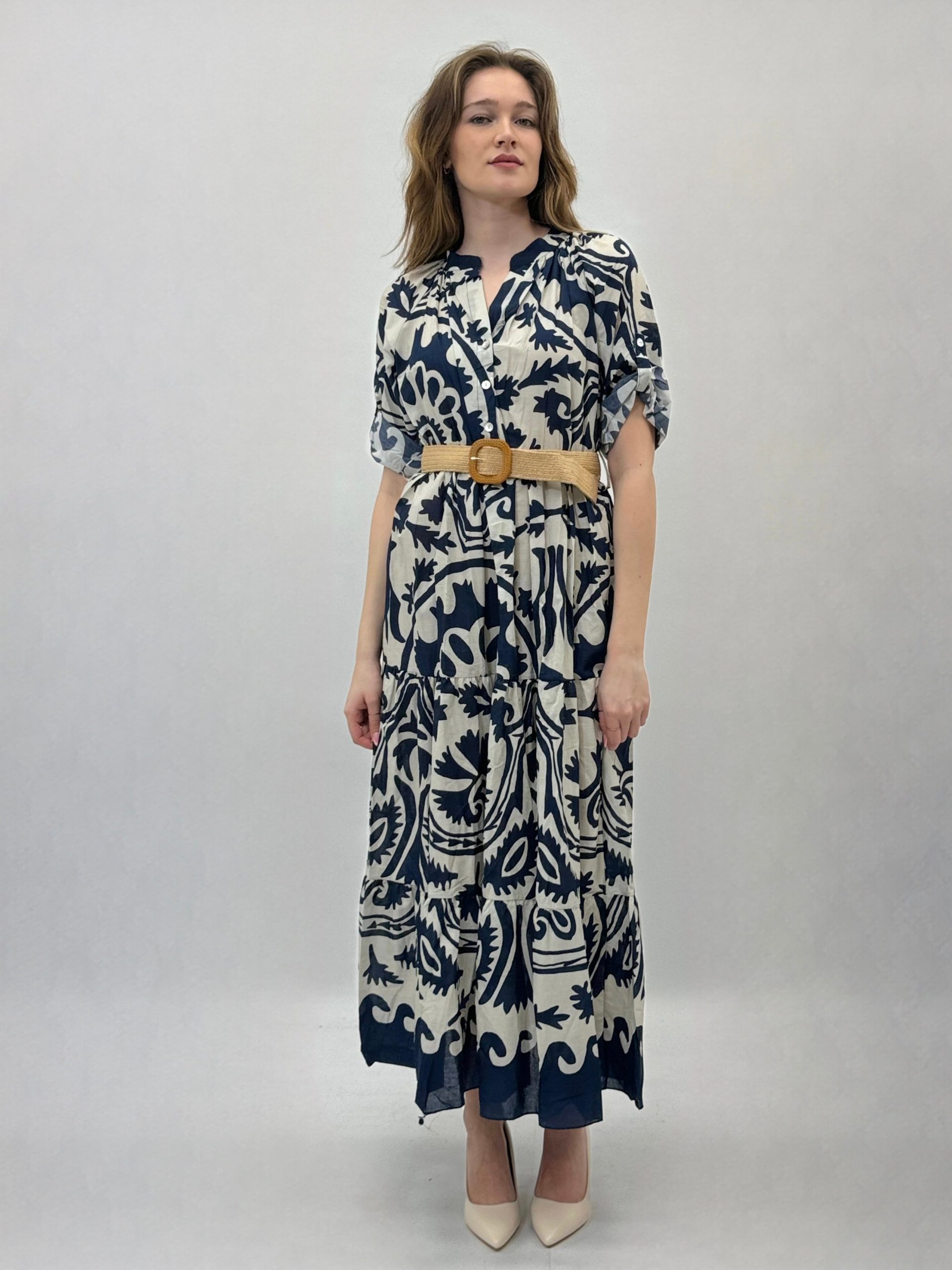 Abito lungo con cintura. Maniche regolabili. Chiusura bottoni.
