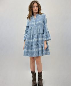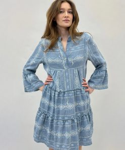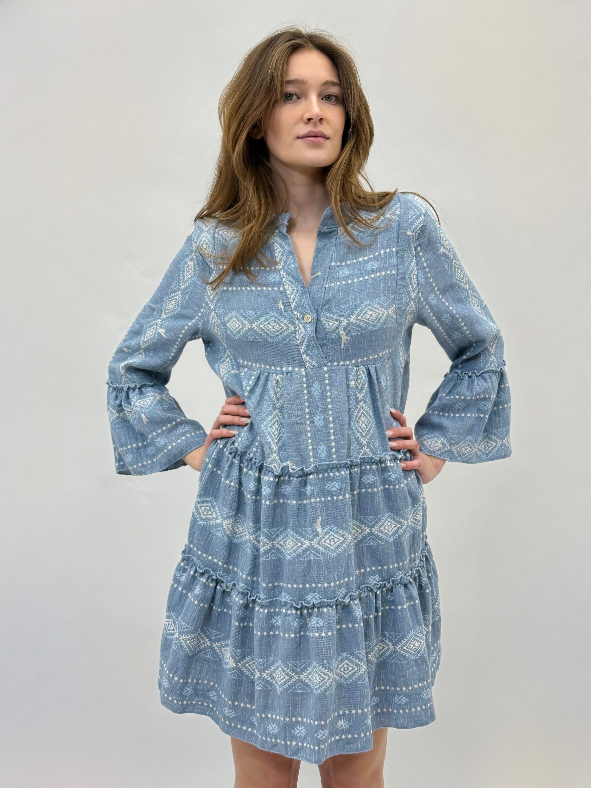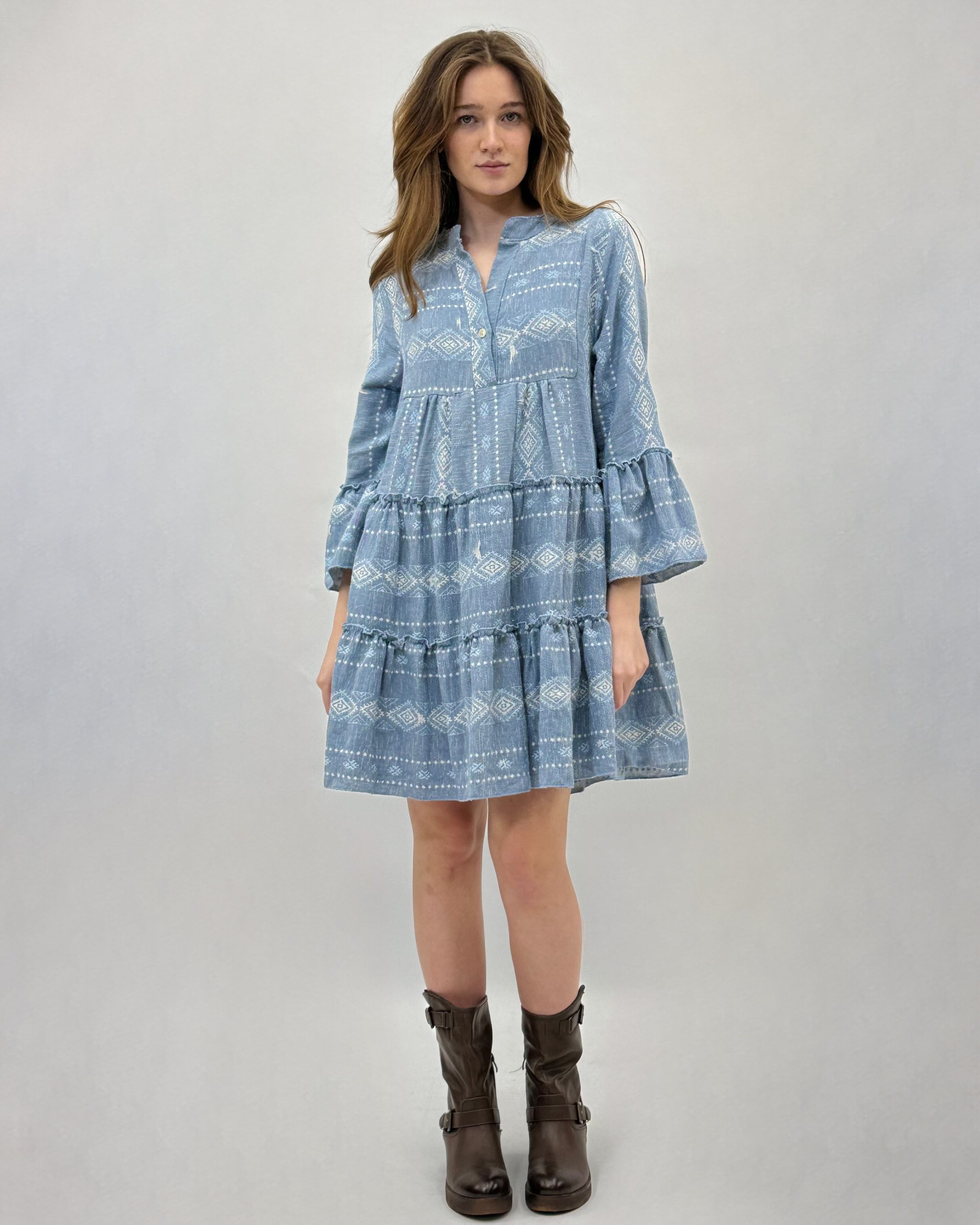 Abito comodo con fantasia rombi. Maniche ampie. Dettaglio balze. Scollo alla coreana.