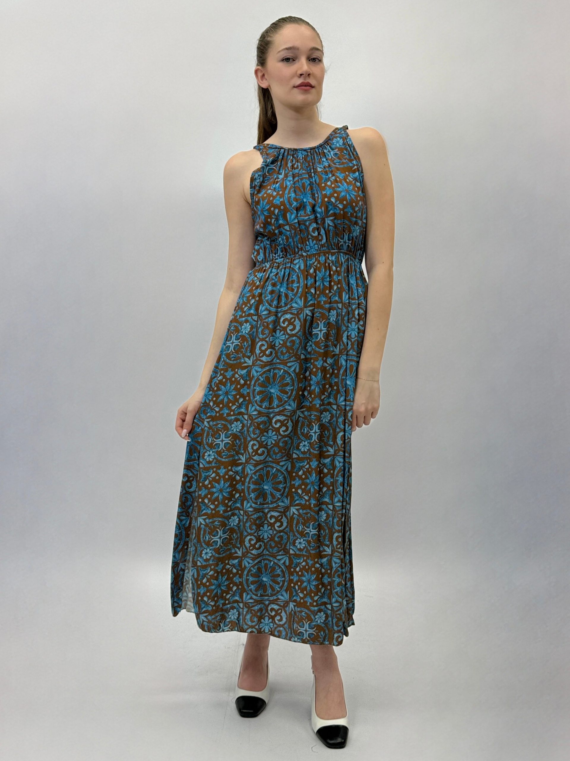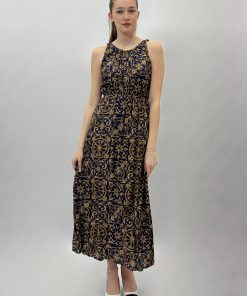 Abito smanicato con fantasia.