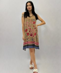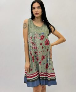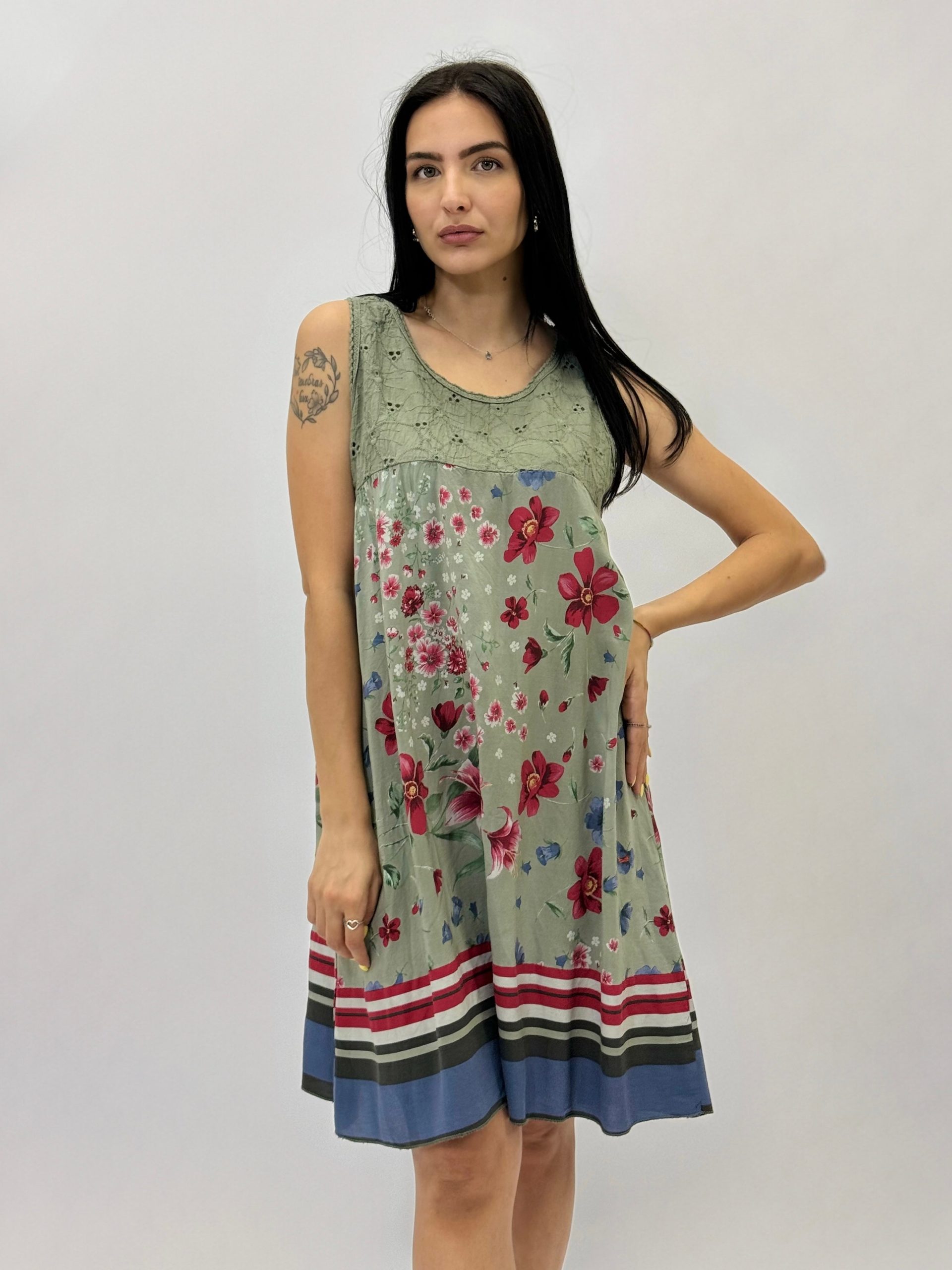 Abito smanicato floreale in cotone. Dettaglio pizzo sangallo.