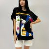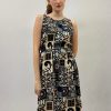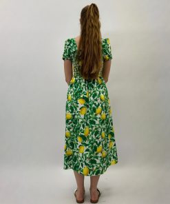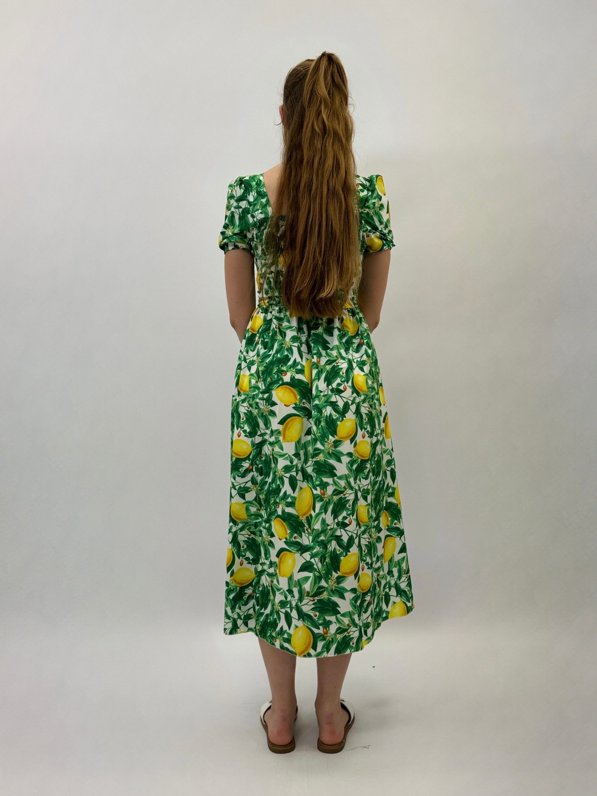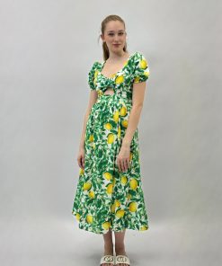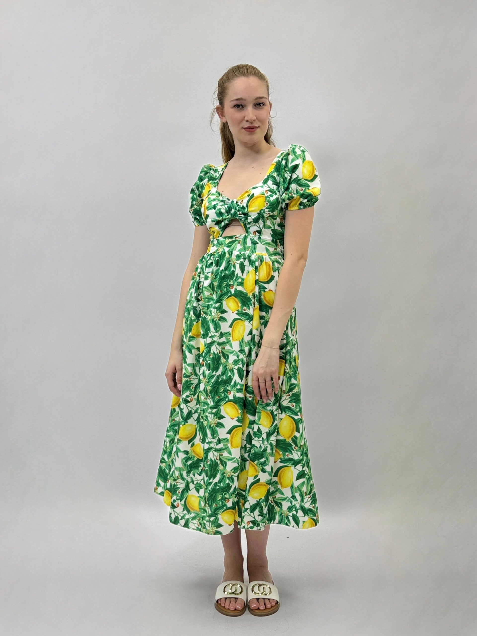 Abito lungo mezza maniche stampa limoni. Dettaglio cut out frontale.