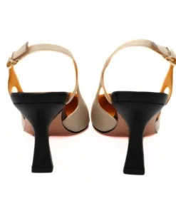 Sandalo, da donna, di ALESSANDRA PELUSO. Esternamente in pelle beige, tacco rivestito in pelle nera. Chiusura con cinturino regolabile alla caviglia. Internamente, e nel morbido sottopiede, foderato in pelle. Suola in cuoio e tacco di 8 cm.