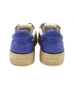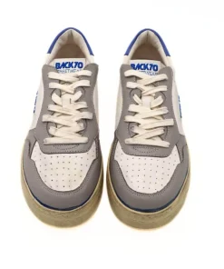 Sneaker da uomo, di BACK70. Realizzata in pelle bianca, con inserti in pelle grigio e azzurro. Internamente foderata in pelle e tessuto con sottopiede estraibile. Chiusura con lacci. Suola in gomma.