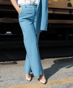 Pantalone a palazzo da donna di BERNA, color azzurro. Dotato di due tasche, chiusura a lapo con bottone in tessuto e passanti per la cintura.