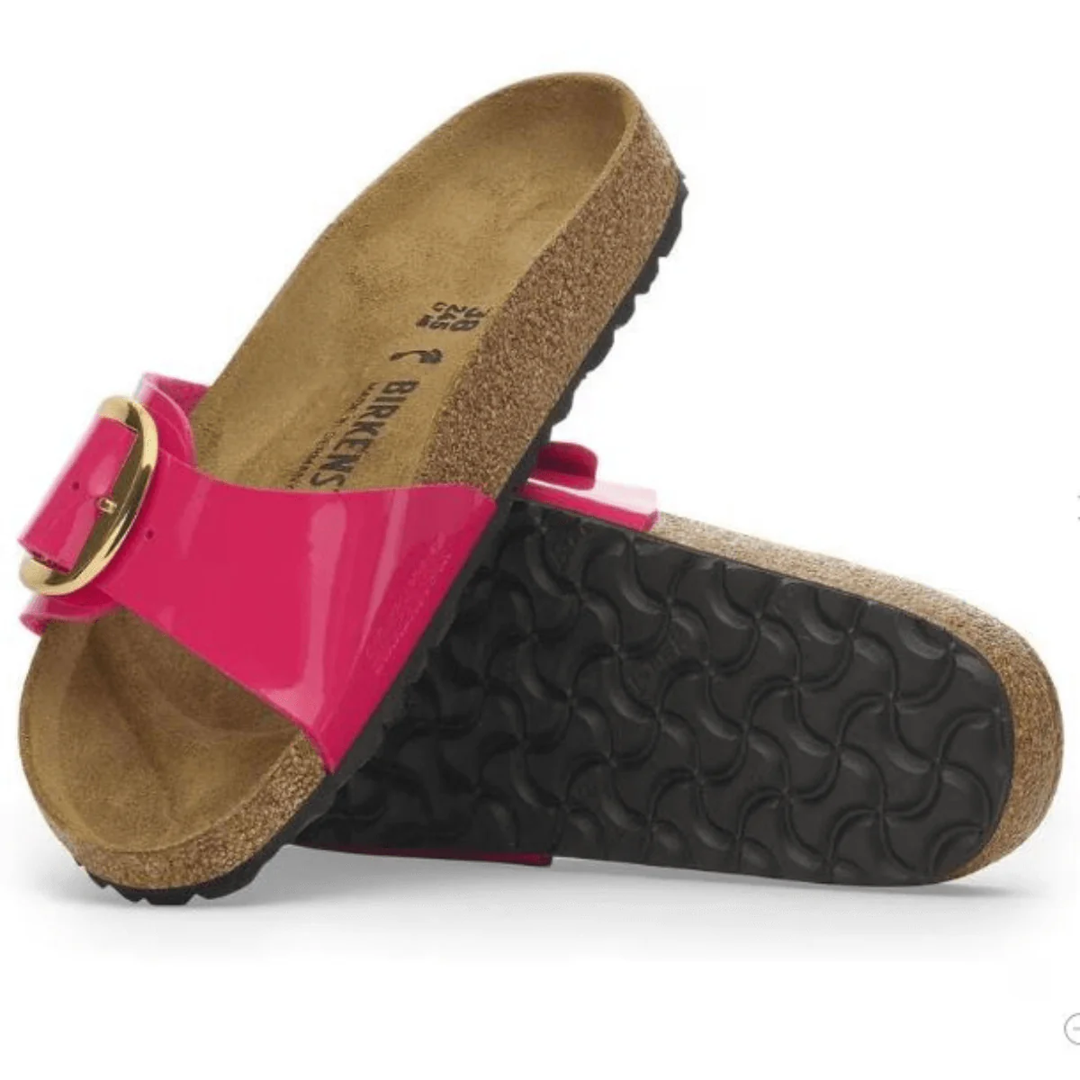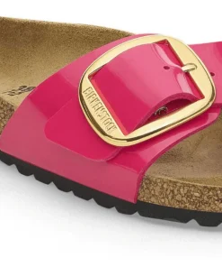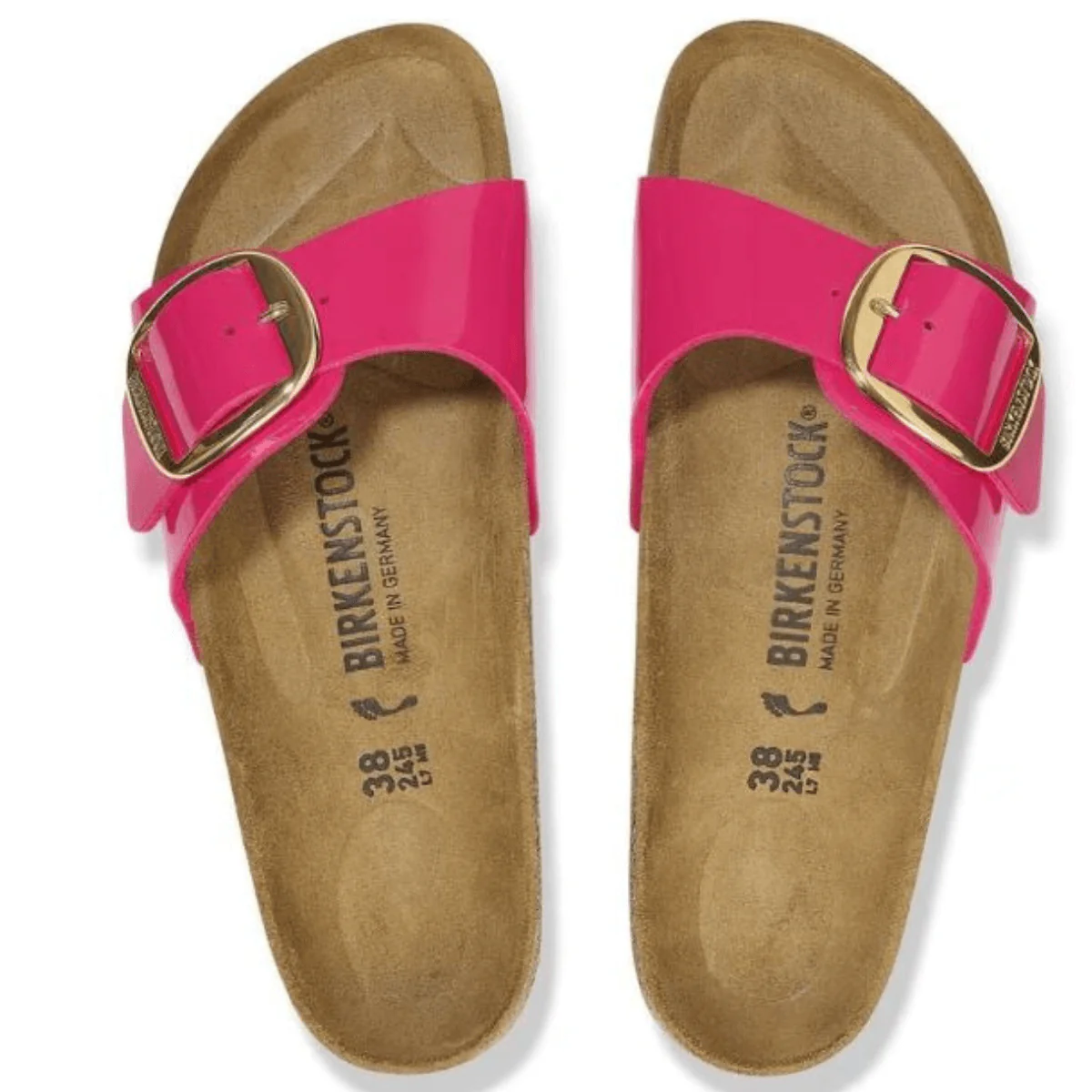 Ciabatta da donna di BIRKENSTOCK modello MADRID, nella versione BIG BUCKLE. Tomaia realizzata in materiale sintetico Birko-Flor®, resistente e delicato sulla pelle, effetto laccato, il plantare è anatomico, rivestito in pelle scamosciata. Suola in EVA. Pianta stretta–narrow fit.