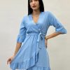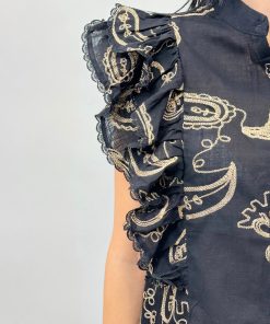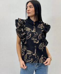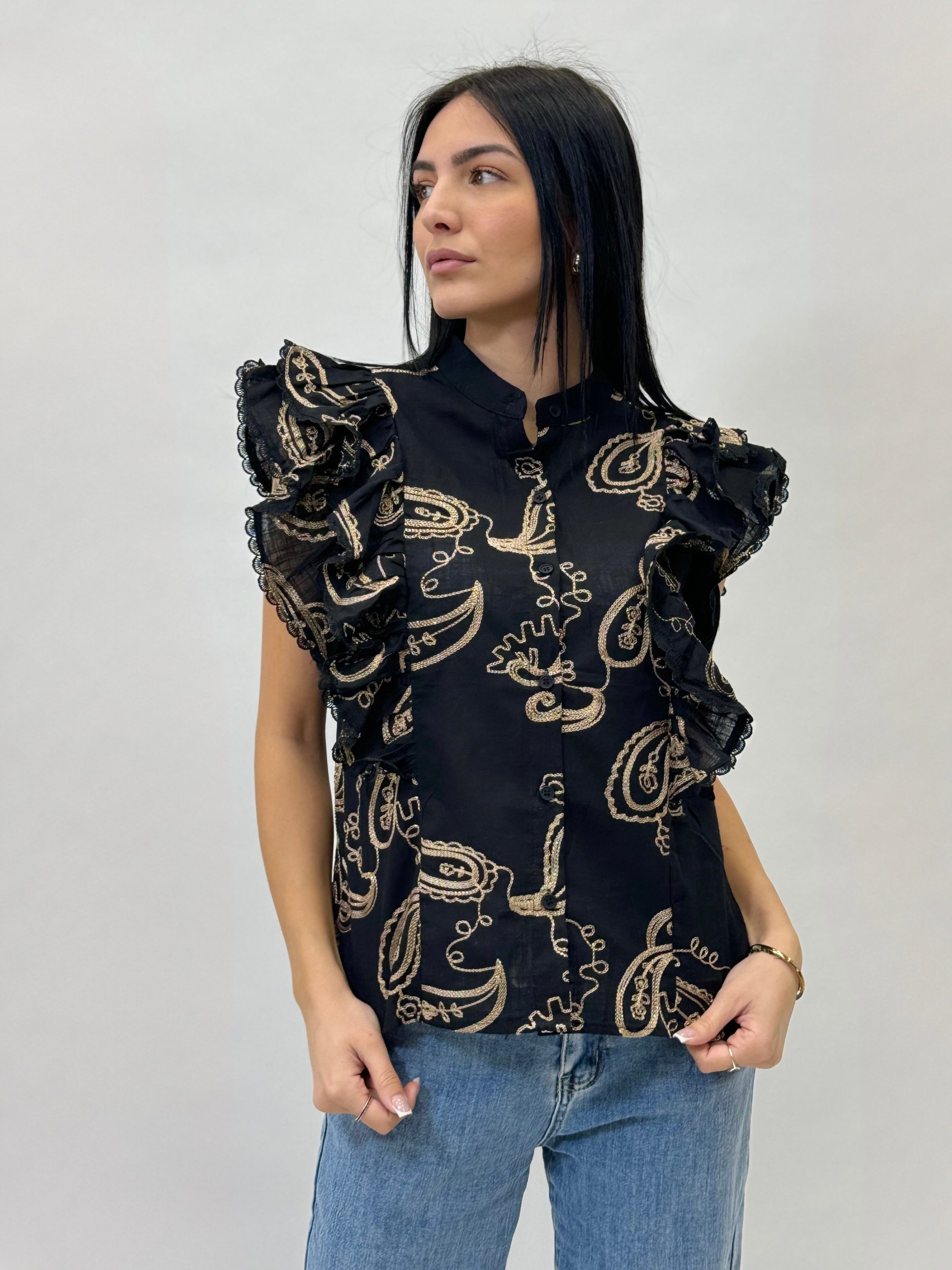 Blusa con maniche a volant con ricami. Chiusura bottoni.