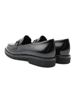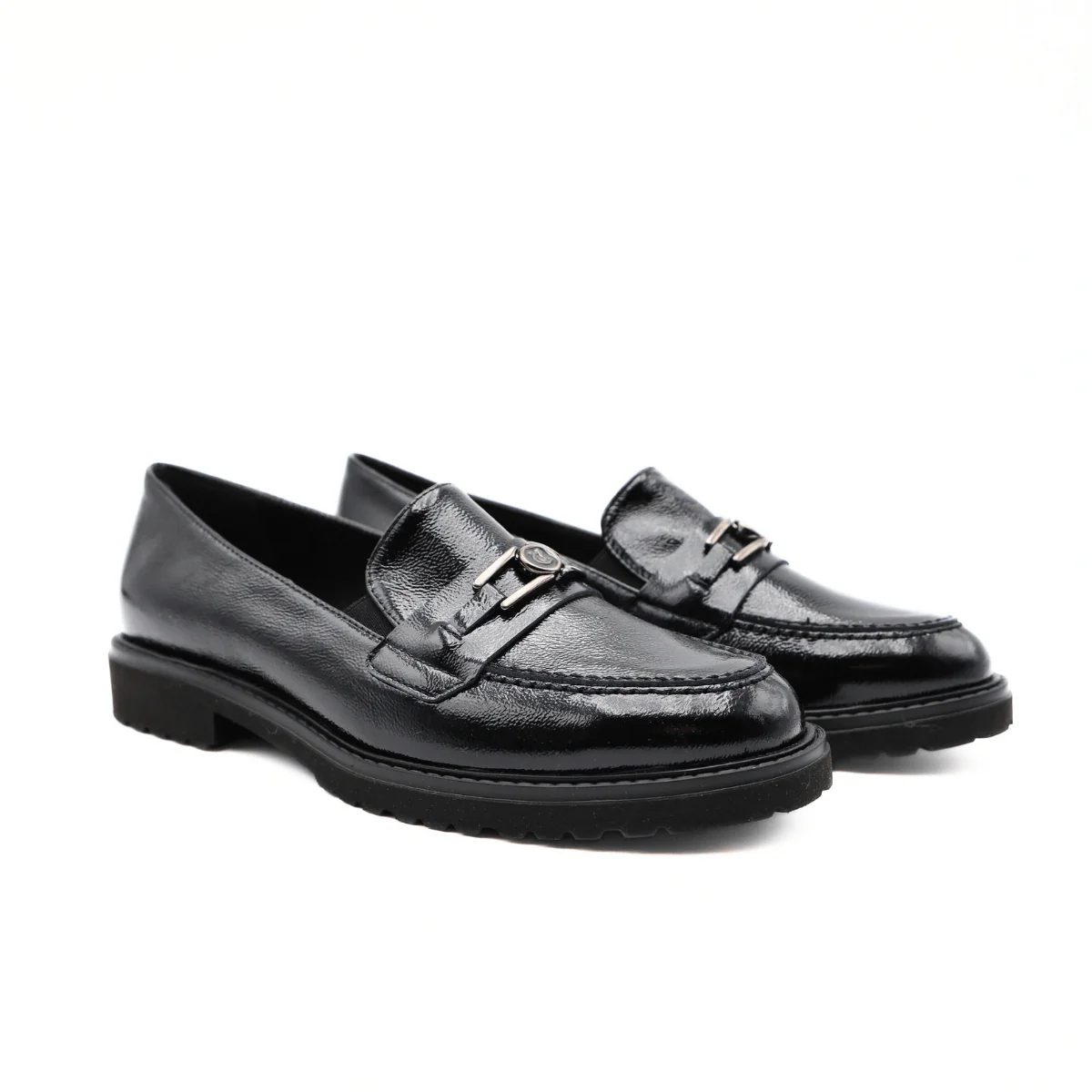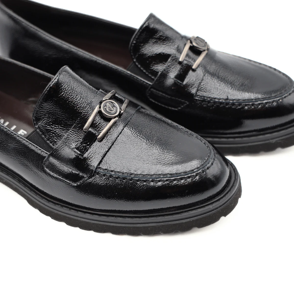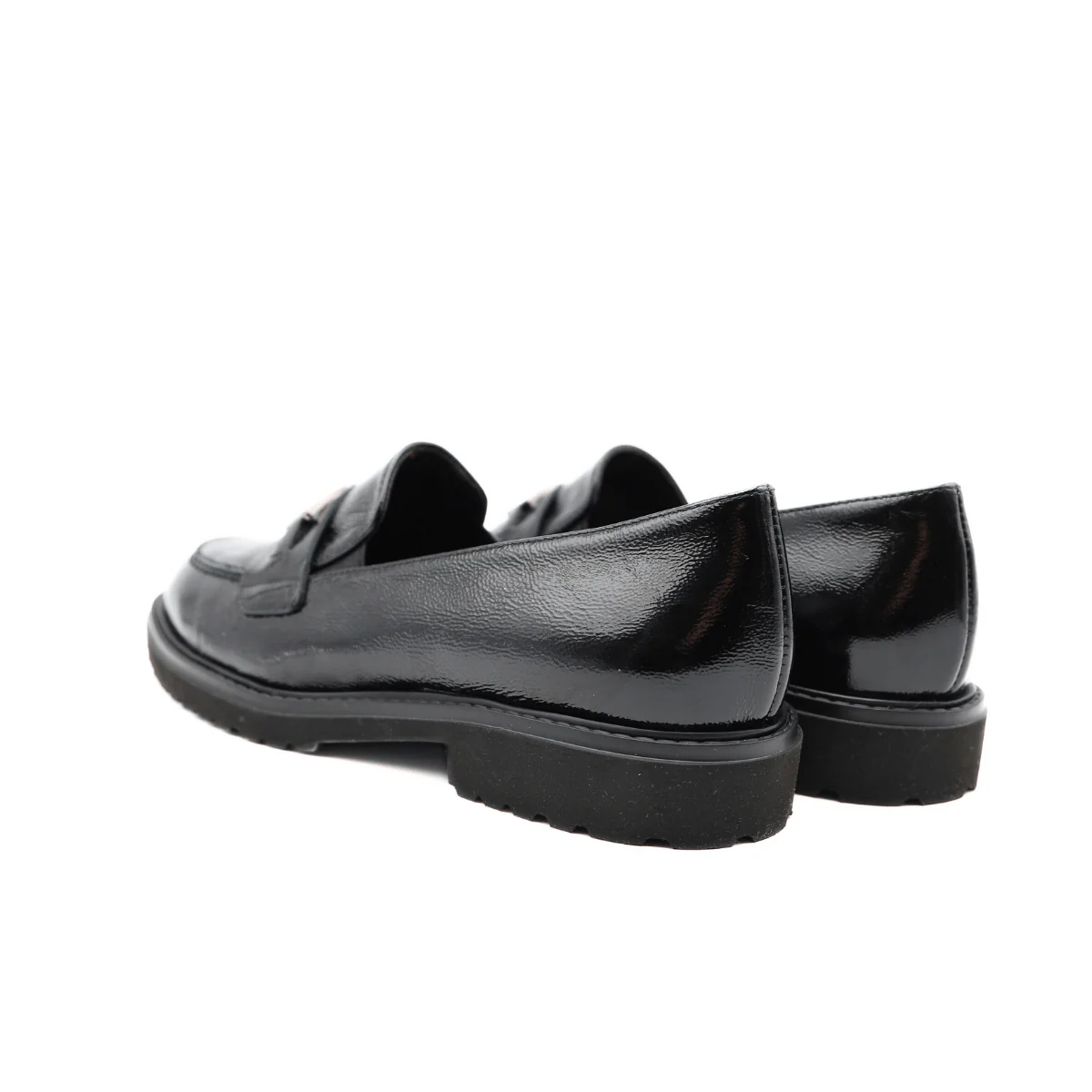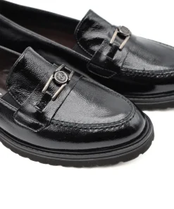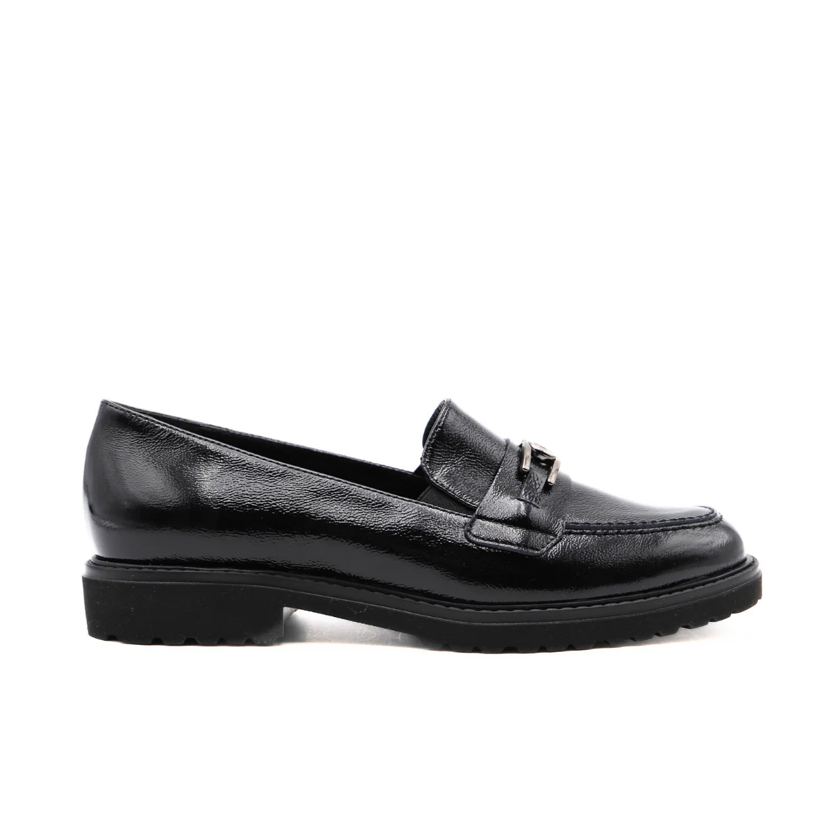 Mocassino da donna di CINZIA VALLE, realizzato in pelle verniciata nera con morsetto decorativo. Interno e sottopiede, morbido, rivestita in pelle. Suola in gomma carrarmato con tacco 2,5 cm.