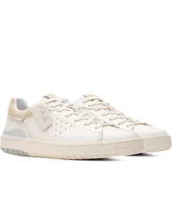 Sneaker da uomo di CLARKS. Tomaia in morbida pelle bianca, con dettagli in camoscio taupe, internamente foderata in tessuto. Suola a cassetta in gomma leggera, saldata alla tomaia tramite cucitura.