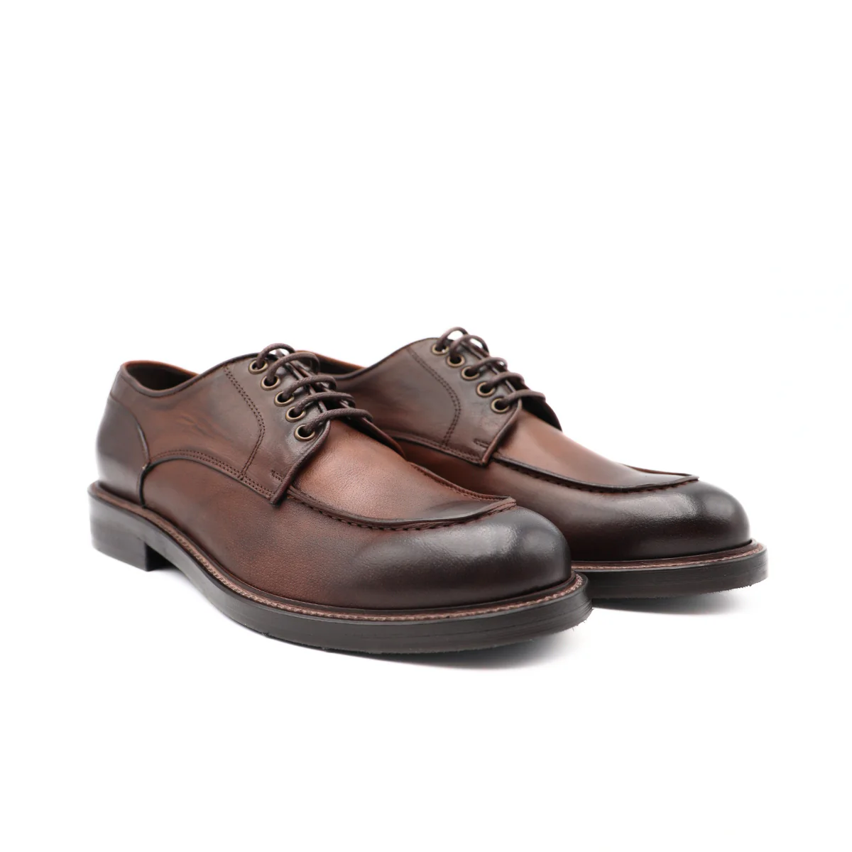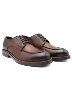 Scarpa stringata casual uomo allacciatura derby, di FRANCO FEDELE. Tomaia in pelle sfumata color testa di moro e cuoio, con cuciture a vista, internamente foderata, e nel sottopiede in pelle. Suola in gomma carrarmato, tacco esterno 3.5 cm. Chiusura con laccio fino.