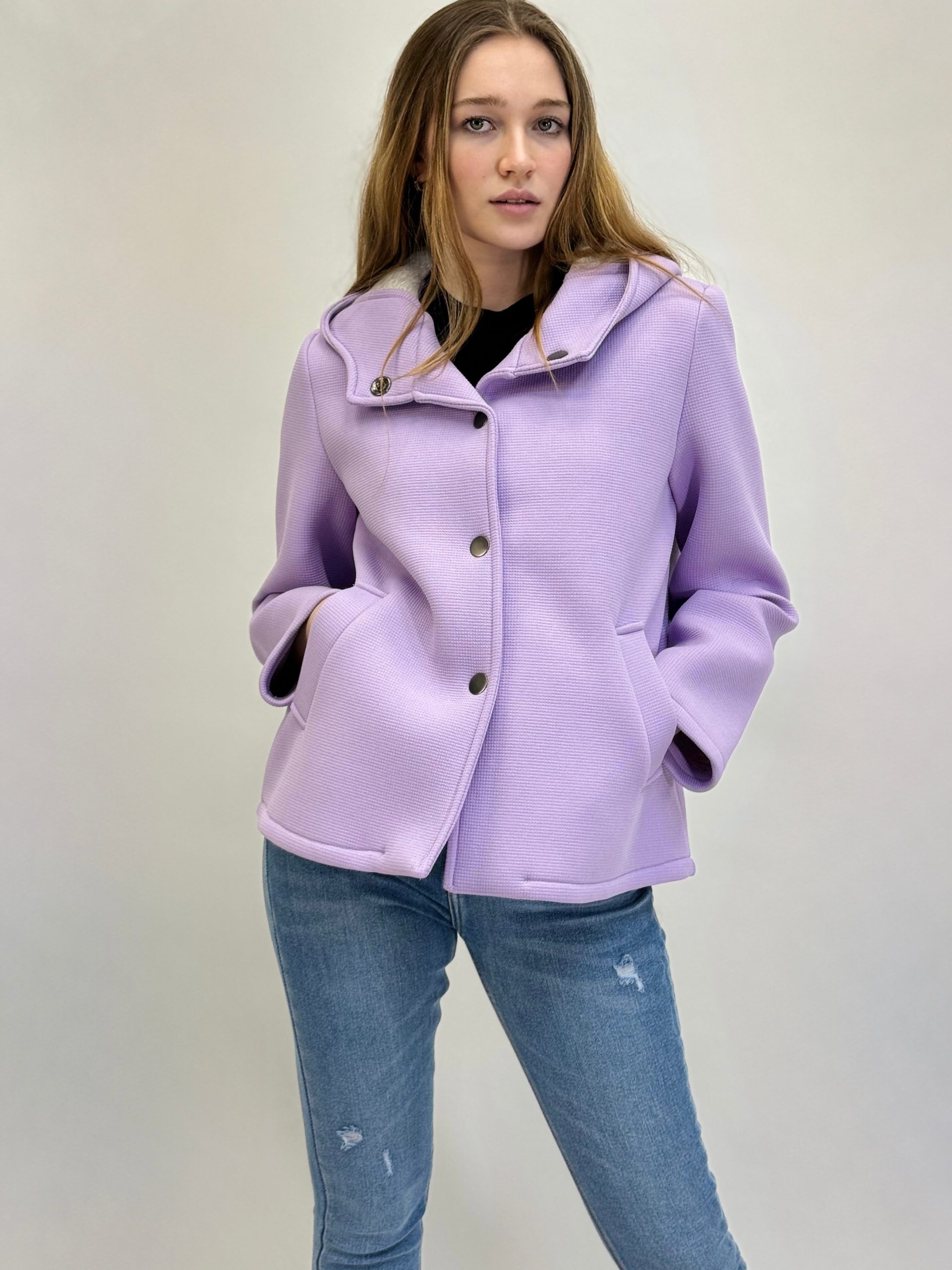 Giacca neoprene tinta unita. Dettagli bottone. Comoda. Cappuccio.