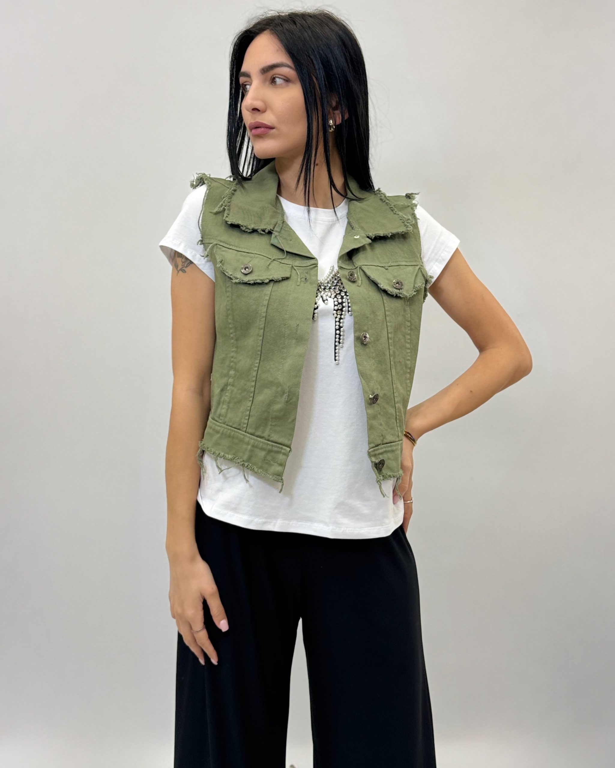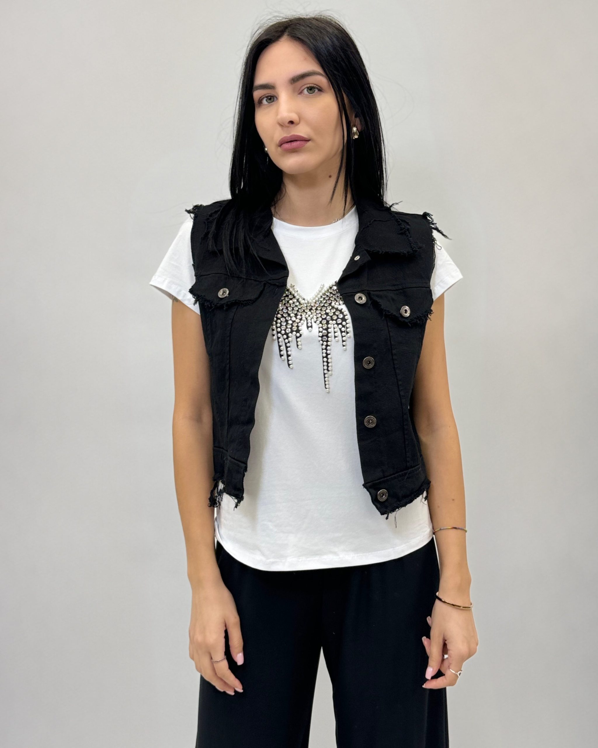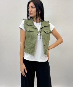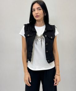 Gilet in jeans tinta unita. Dettaglio bottoni.