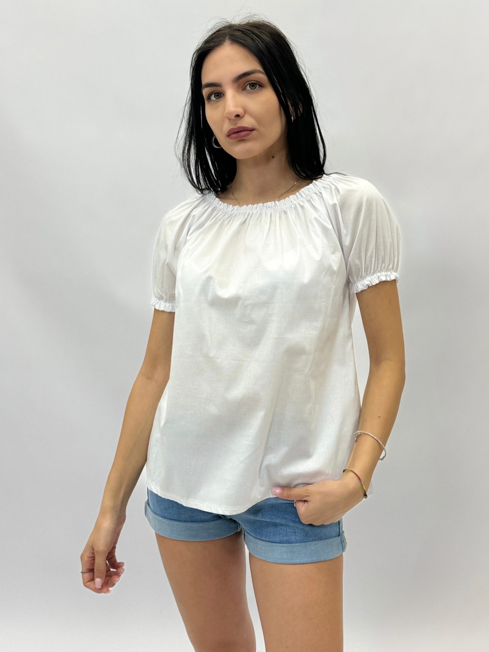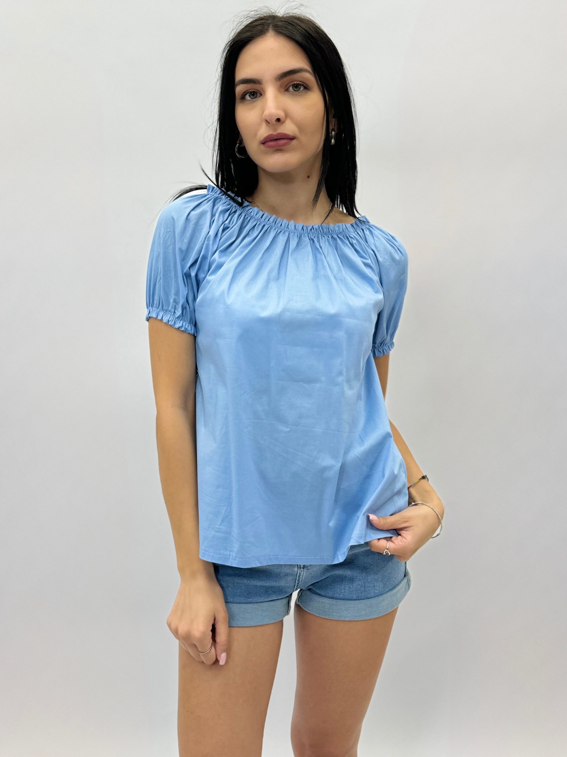 Maglia mezze maniche tinta unita con maniche a palloncino.