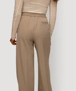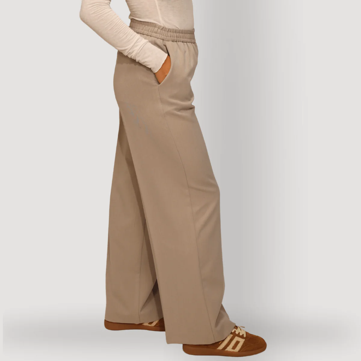Pantapalazzo da donna di MARKUP realizzato in tessuto flanella beige. Pantalone con gamba larga ed elastico in vita. La modella indossa una 42.