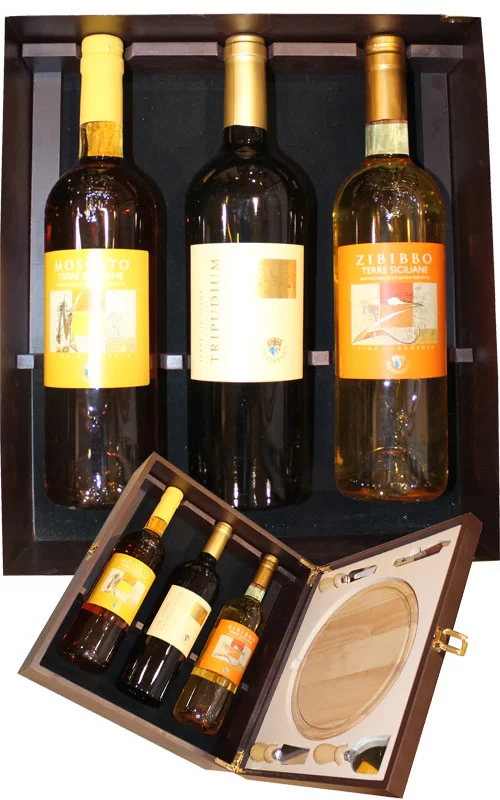 Simpatica idea regalo: box in legno con 3 vini da meditazione, da abbinare a dolci e formaggi, oltre ad un pratico tagliere con posate per degustazione formaggi.