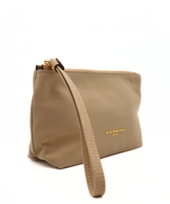 Pochette di NANNINI realizzata in nylon di colore beige. Logo metallico oro applicato e scomparto principale con chiusura zip. Laccio in pelle per portabilità al polso.