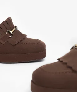 Mocassino donna di Nero Giardini. Tomaia realizzata in pelle scamosciata color testa di moro con morsetto oro e frange. Interno foderato in pelle, sottopiede non estraibile. Suola in gomma.