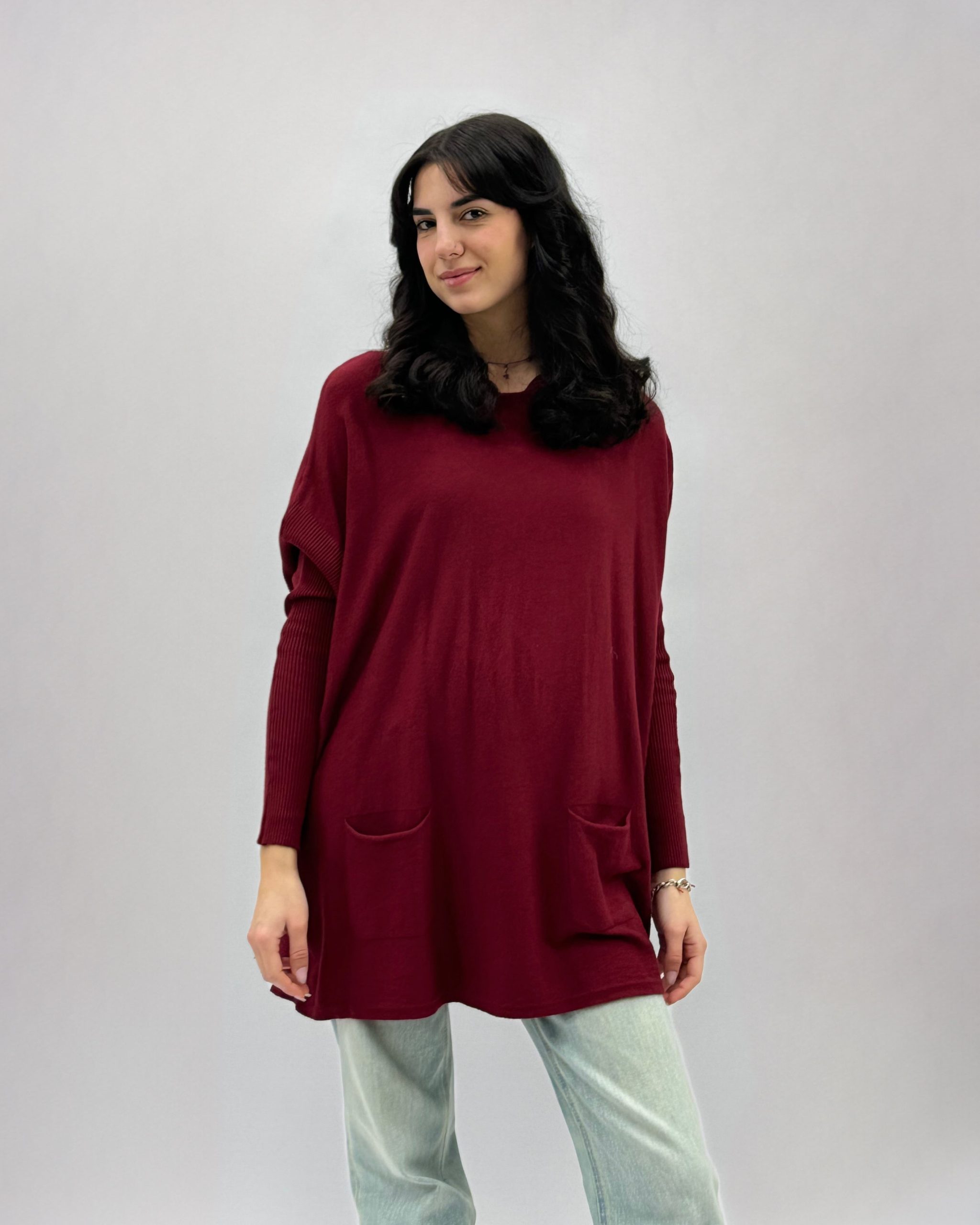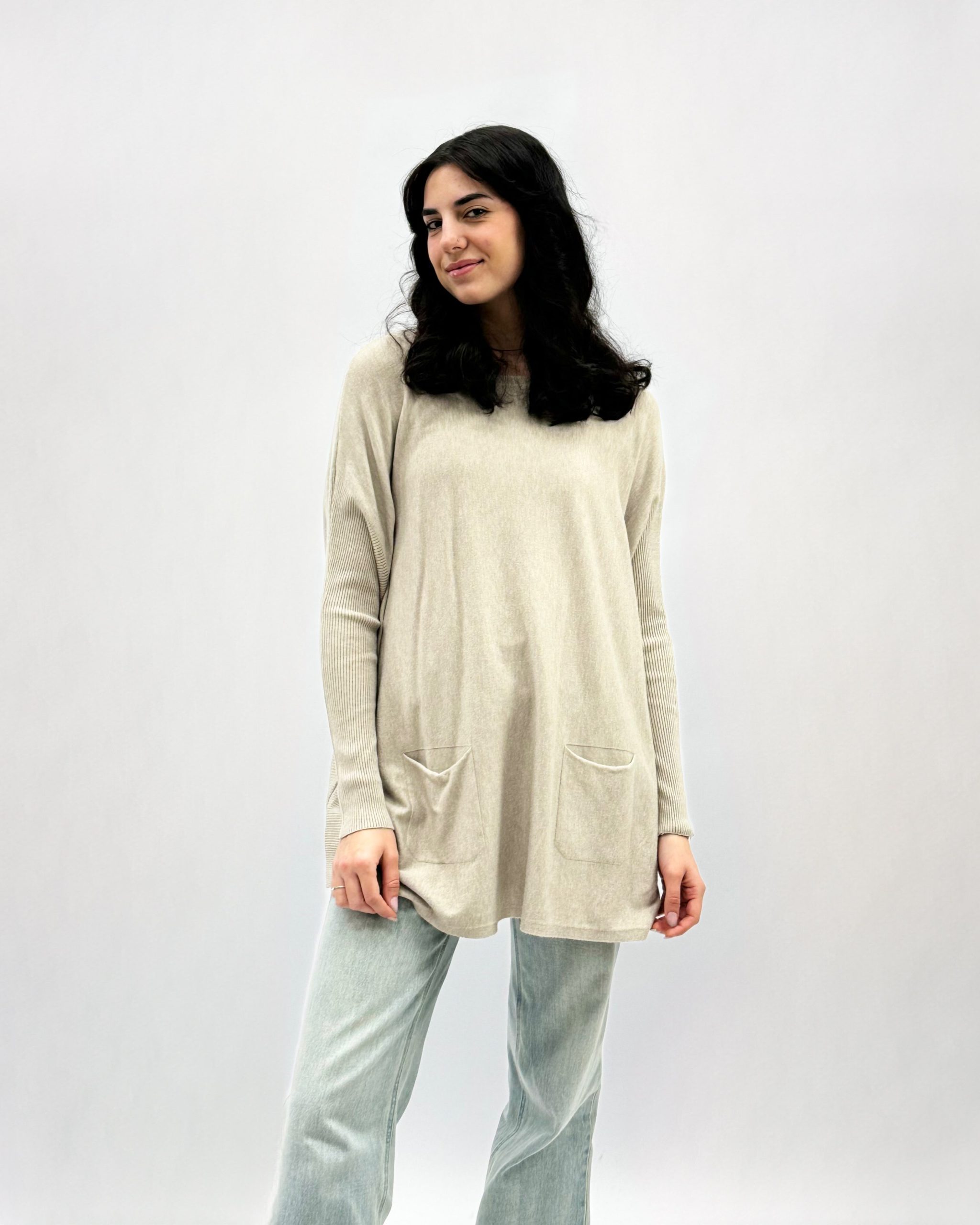 Pullover ampio girocollo con tasche. Veste comodo.