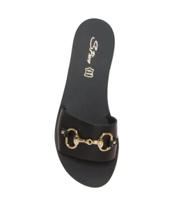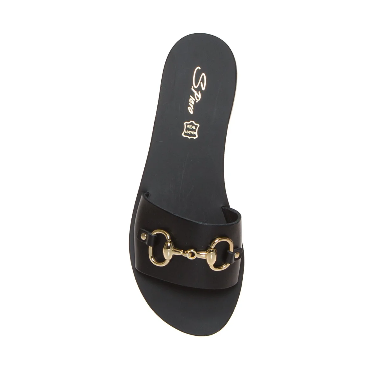 Ciabatta in pelle nera, con accessorio dorato nella fascia, di S. PIERO. Sottopiede in pelle-cuoio, suola in gomma antiscivolo, tacco 1 cm. Calzatura artigianale made in Greece.